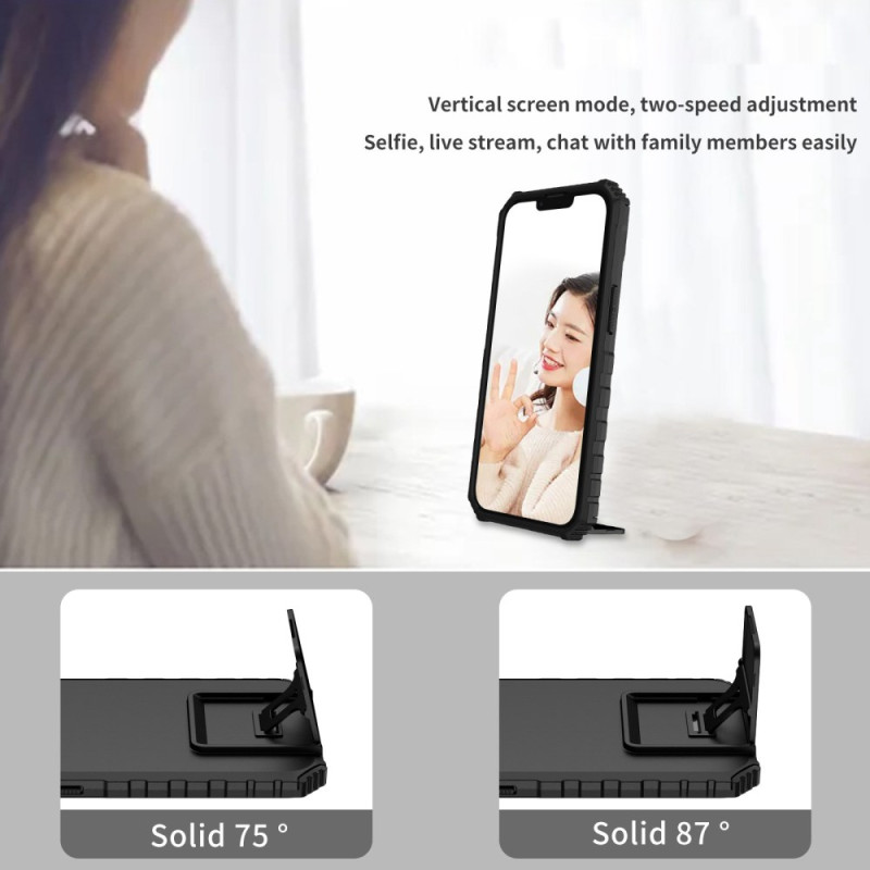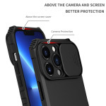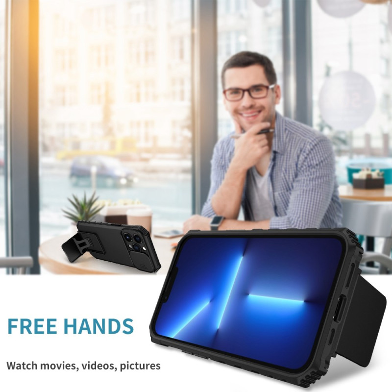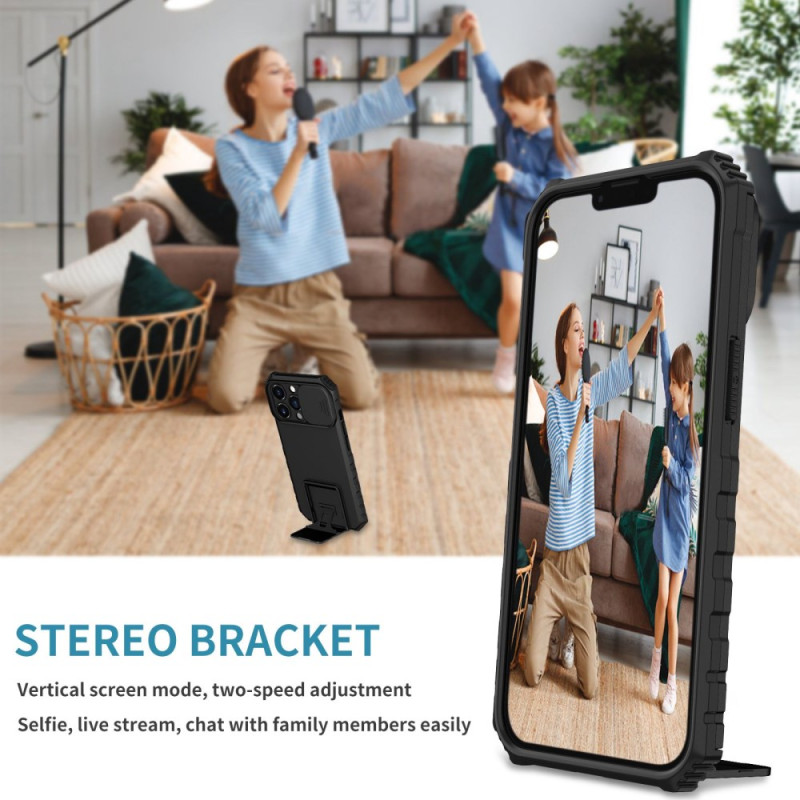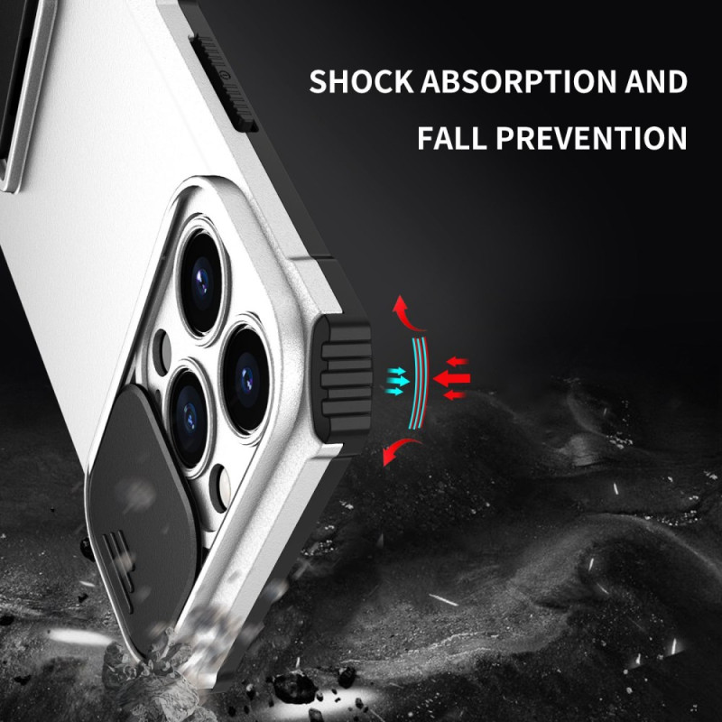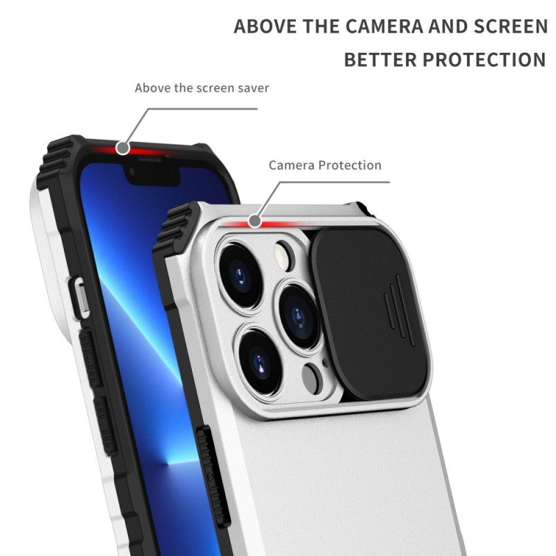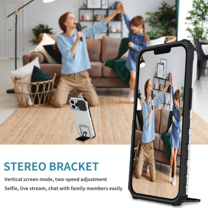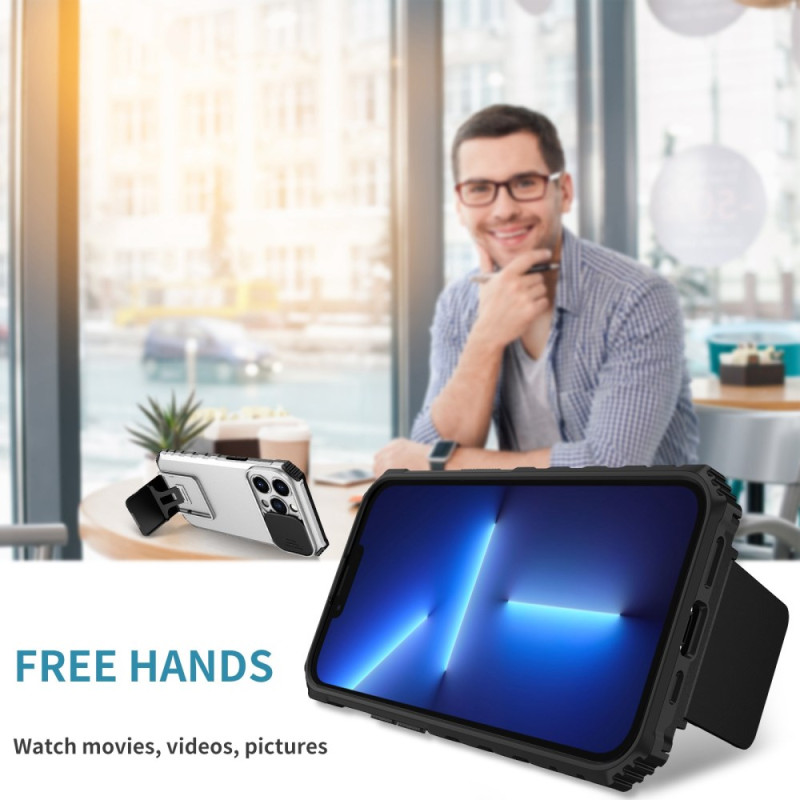 Protégez votre iPhone 13 Pro avec cette coque innovante dotée d'un cache caméra coulissant et d'un support vertical ajustable. Conception bi-matière alliant souplesse et rigidité pour une protection optimale contre les chocs, rayures et poussière.