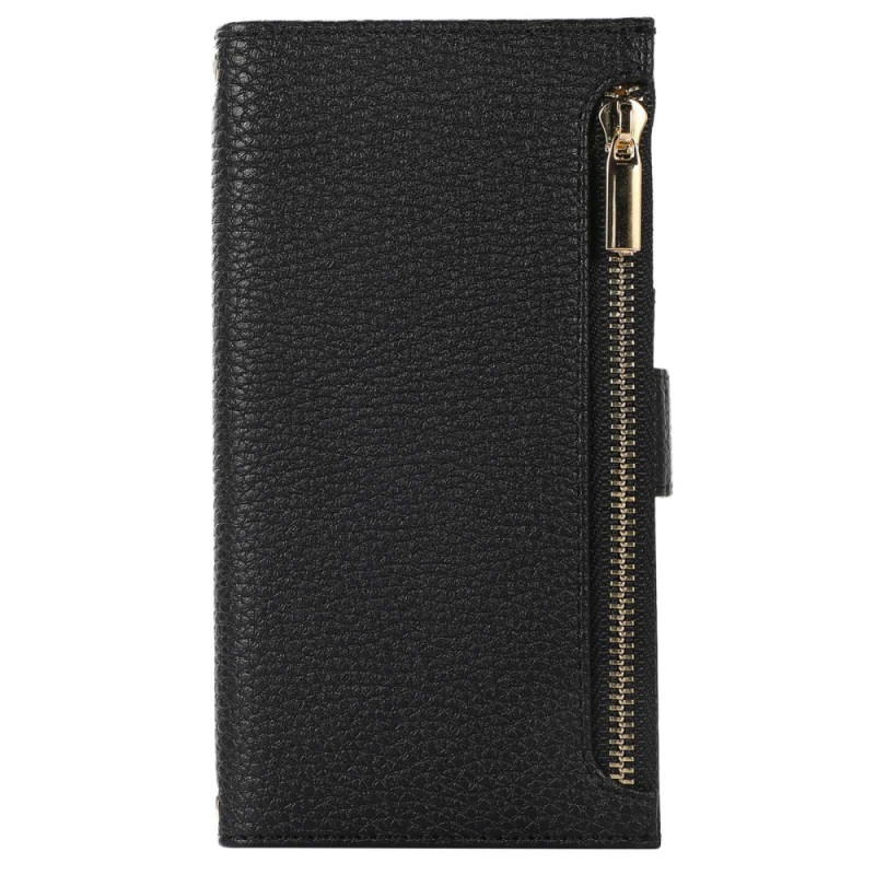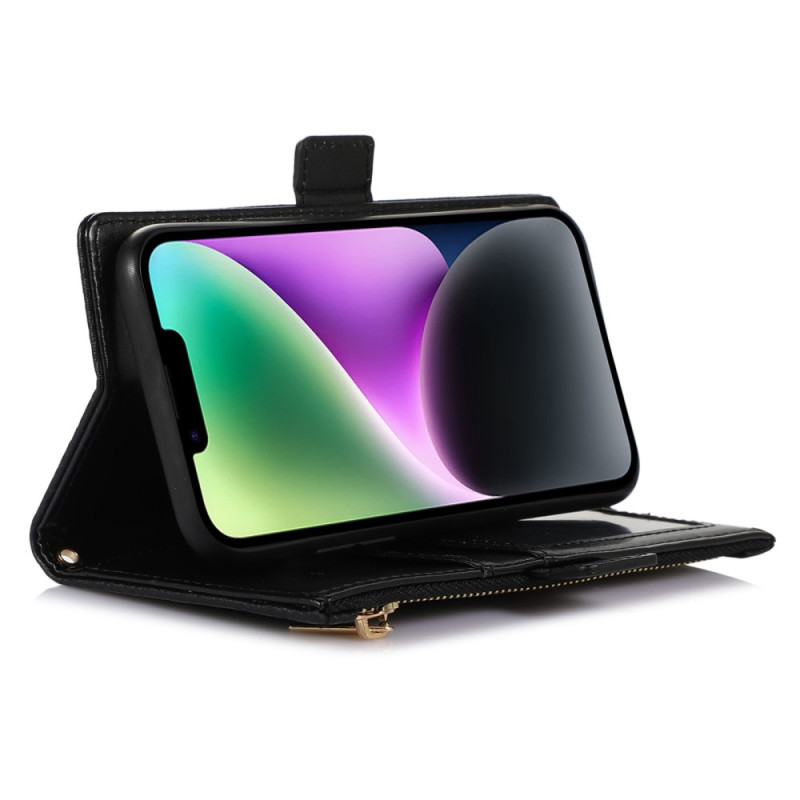 La housse effet cuir Litchi munie d'une fermeture éclaire sécurise parfaitement le iPhone 14 Plus tout en servant de portefeuille (avec une lanière jointe).