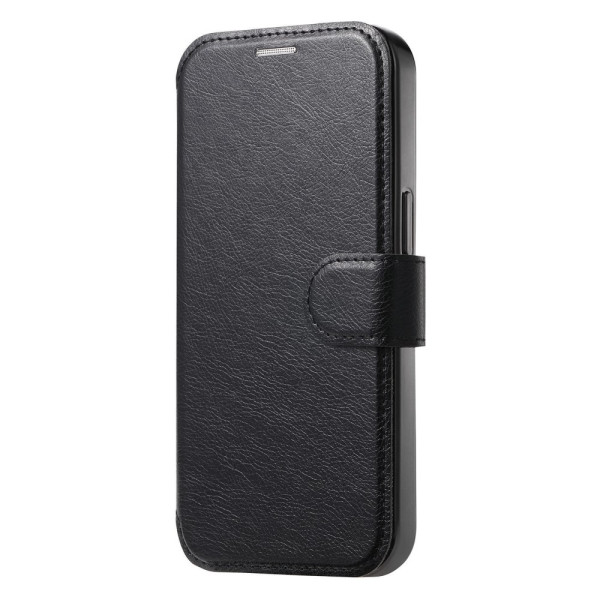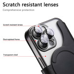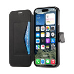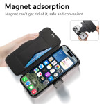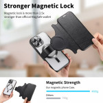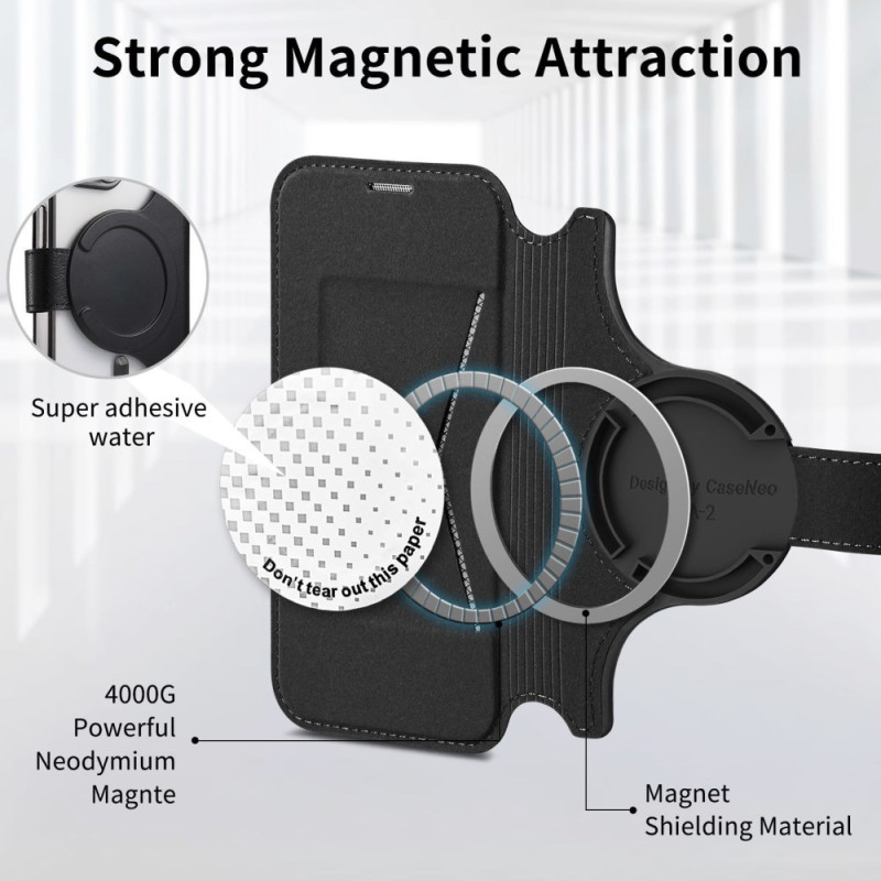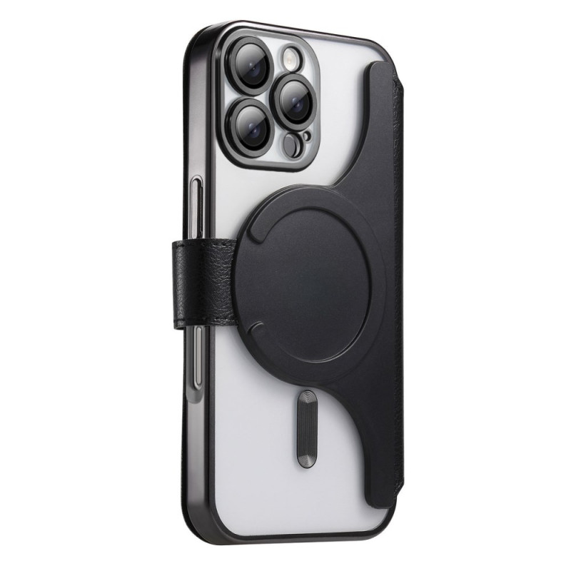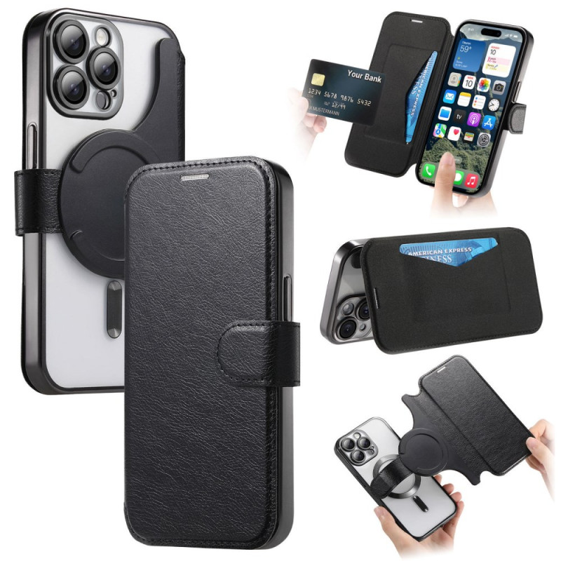 Coque élégante en cuir PU avec étui TPU transparent offrant une protection complète. Compatible MagSafe avec aimant puissant, support ajustable intégré et porte-cartes avec technologie RFID pour sécuriser vos informations.