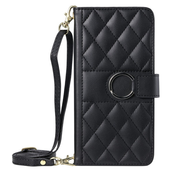 Étui portefeuille élégant en cuir synthétique avec design losange raffiné. Comprend 5 emplacements pour cartes, une poche à monnaie, un anneau décoratif et deux bandoulières (poignet et crossbody ajustable 145cm).