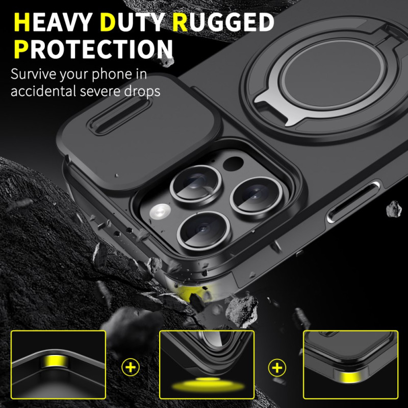 Protégez votre iPhone 14 Pro Max avec style grâce à cette coque magnétique innovante. Dotée d'une double couche TPU+PC résistante aux chocs, d'un cache objectif coulissant et d'un anneau support rotatif 360°, elle allie sécurité et praticité.
