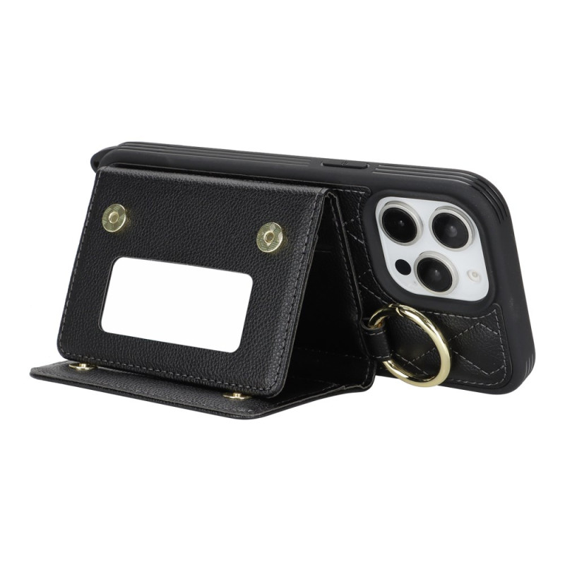 Découvrez notre coque innovante pour iPhone 15 Pro. Dotée d'un porte-cartes, d'un miroir intégré et d'une lanière ajustable, elle allie fonctionnalité et protection. Fabriquée en cuir PU texturé et TPU, elle offre une protection durable contre les chocs et les rayures. Le support intégré et la technologie de blocage RFID en font un accessoire pratique au quotidien.