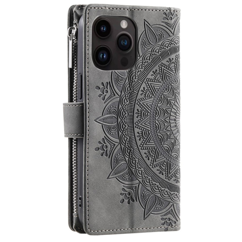 Découvrez notre étui pour iPhone 16 Pro avec un motif de fleur de mandala et une poche à fermeture éclair.