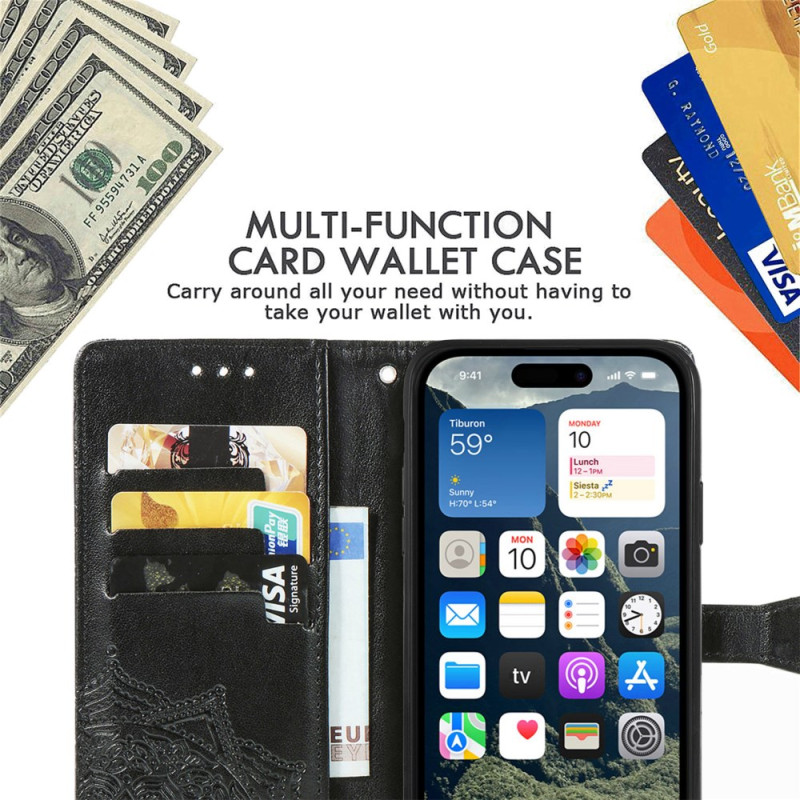 Découvrez notre élégante housse portefeuille pour iPhone 17E / 16E. Dotée d'un motif mandala en relief, elle offre une protection durable, des rangements pratiques et un support intégré. Idéale pour allier style et fonctionnalité au quotidien.