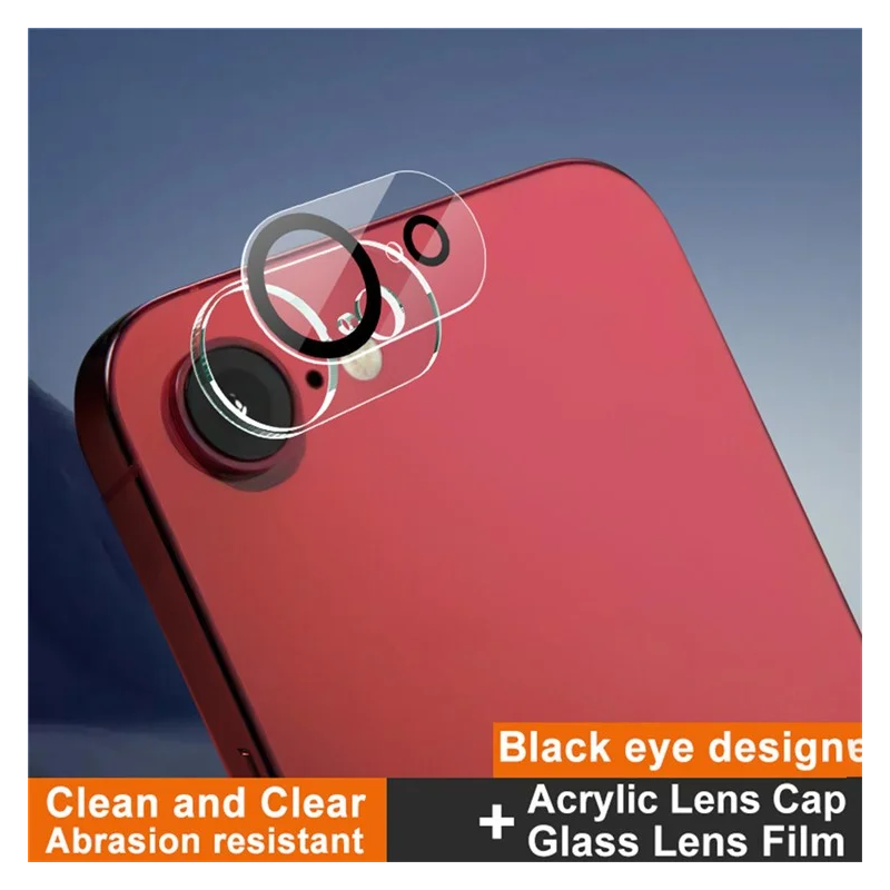 Découvrez l'IMAK pour iPhone 17E / 16E avec capuchon de lentille en acrylique intégré et film de lentille arrière en verre trempé.