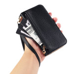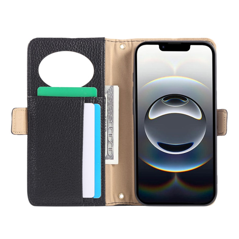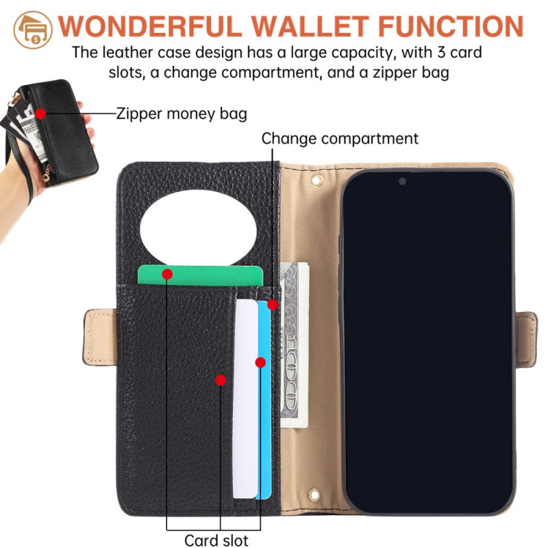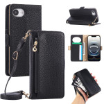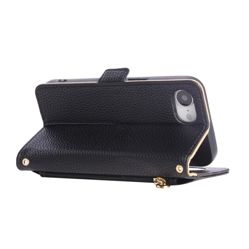 Étui portefeuille élégant pour iPhone 17E / 16E combinant protection antichoc et fonctionnalité. Doté d'un miroir intégré, de multiples emplacements pour cartes, d'une technologie de blocage RFID et d'une bandoulière amovible pour un transport mains libres.
