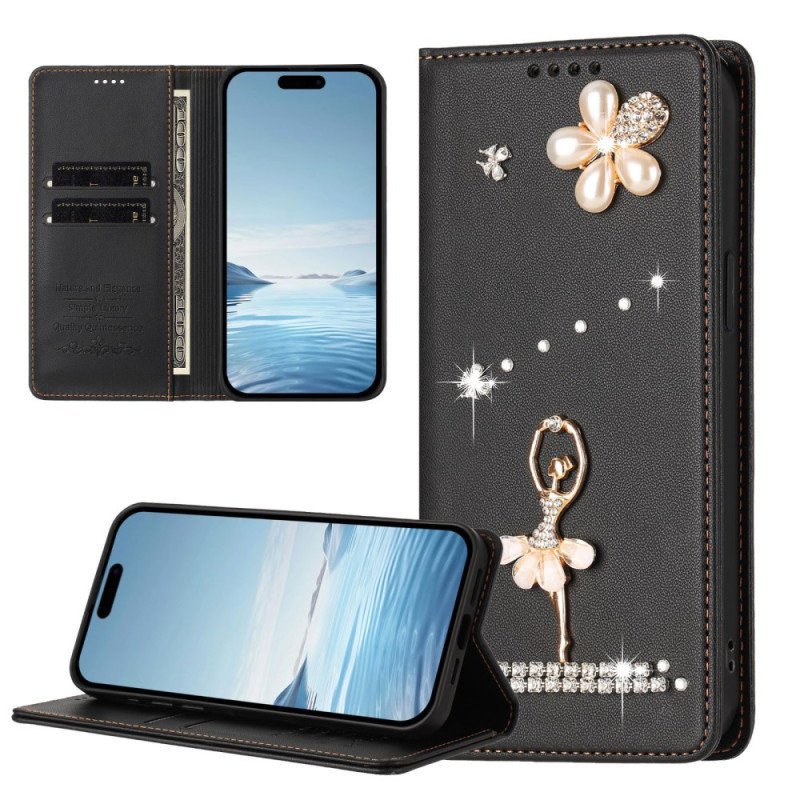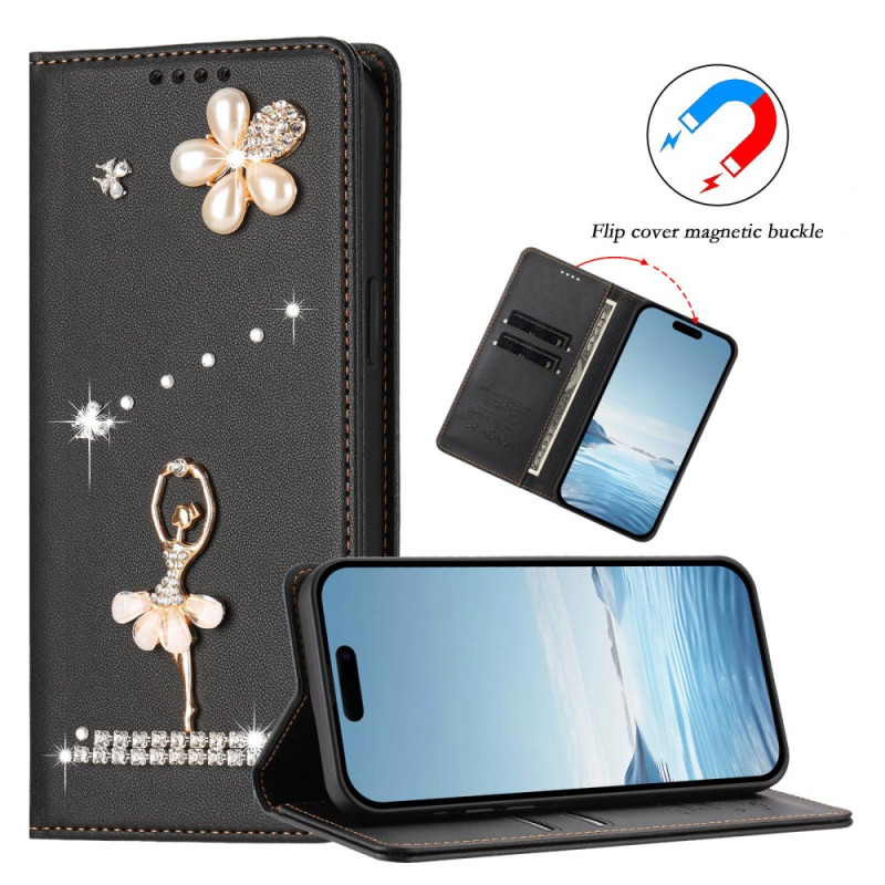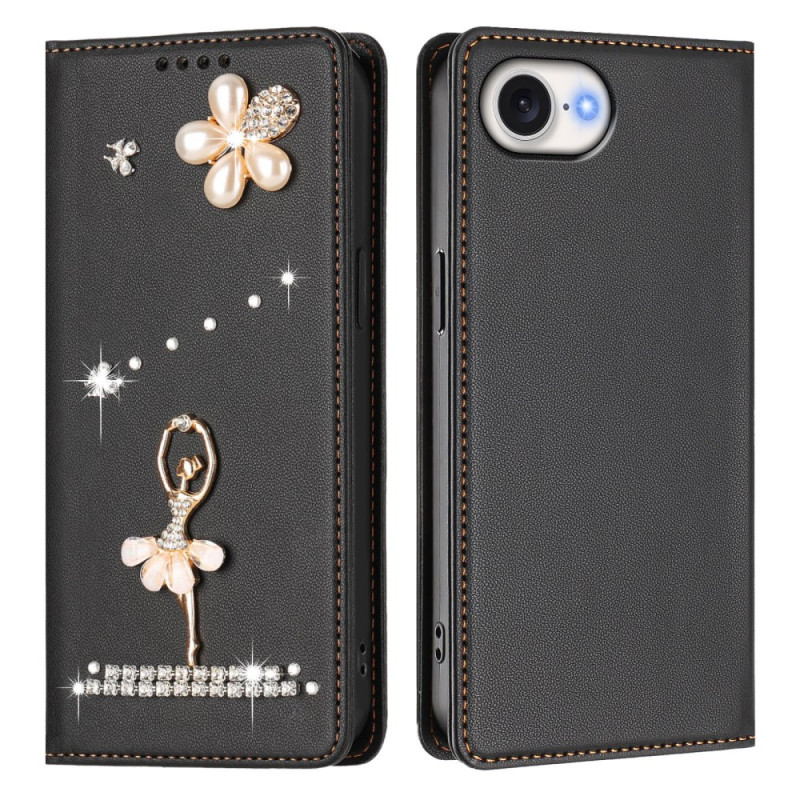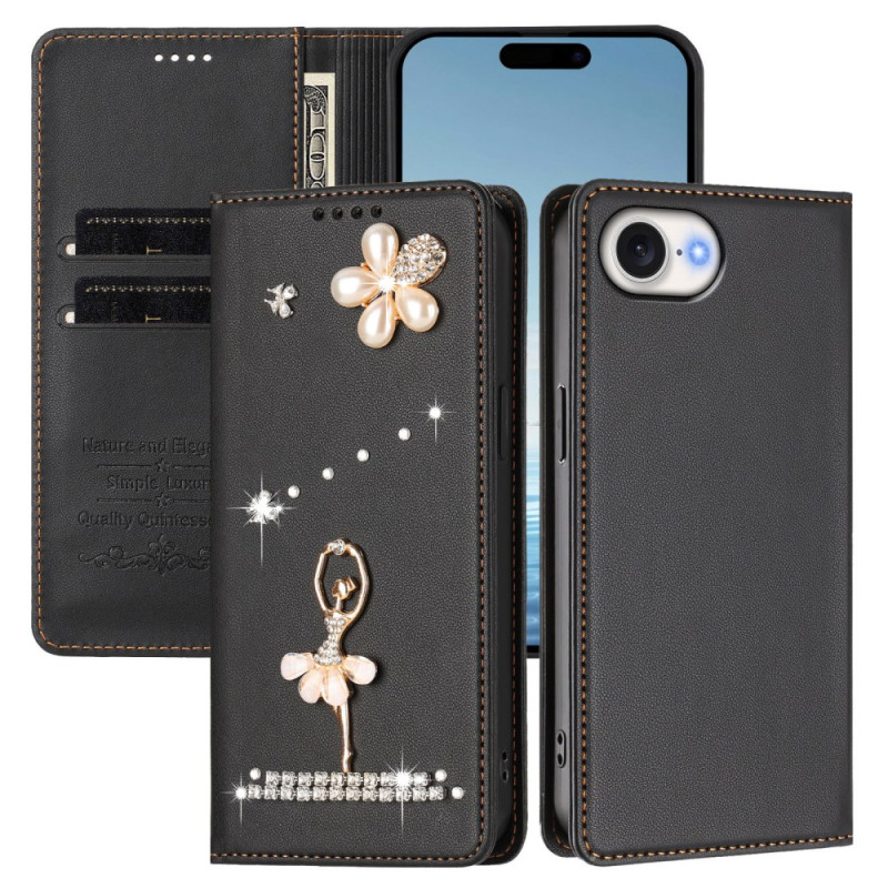 Élégant étui portefeuille à rabat magnétique pour iPhone 17E / 16E avec protection RFID intégrée. Design raffiné orné d'une danseuse de ballet en strass 3D. Comprend 2 emplacements pour cartes, 1 compartiment pour billets et fonction support ajustable.