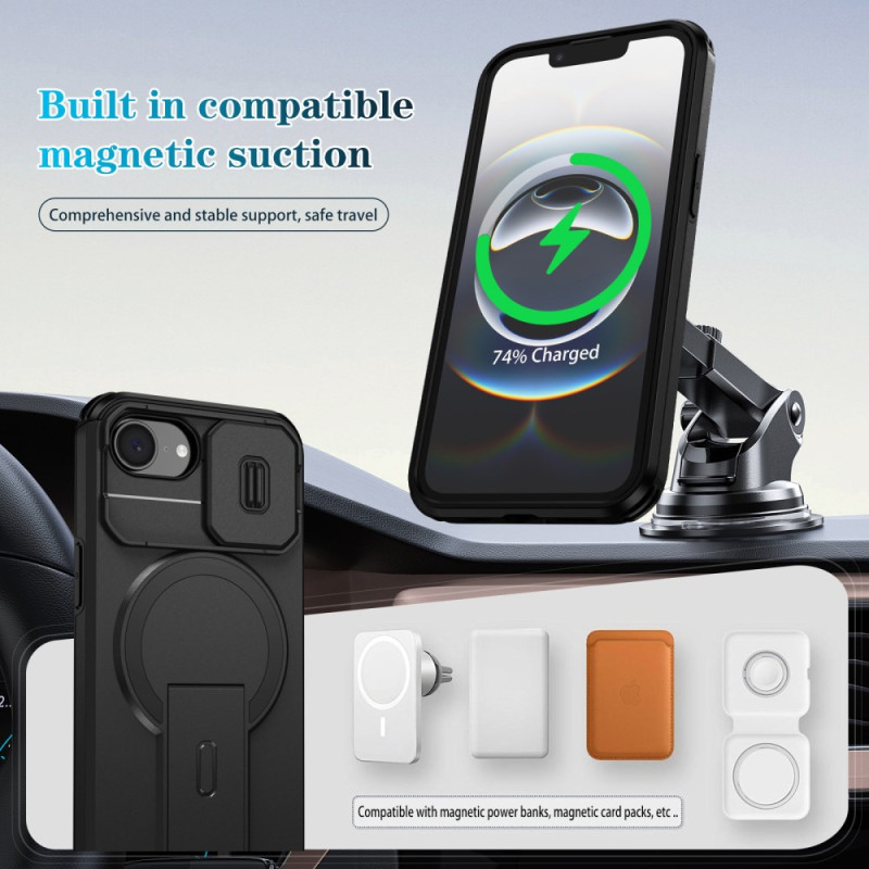 Protégez votre iPhone 17E / 16E avec cette coque innovante dotée d'une double couche PC + TPU résistante aux chocs. Equipée d'un support pliable intégré, d'un cache caméra coulissant et d'une compatibilité MagSafe optimale pour une protection complète.