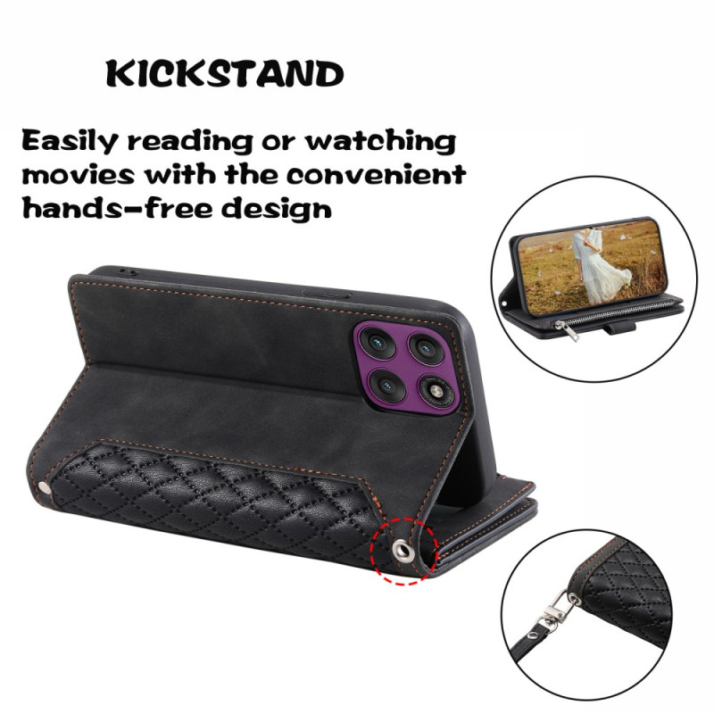 Étui portefeuille élégant en cuir PU avec motif losange pour Motorola Edge 70 5G. Comprend plusieurs emplacements pour cartes, poche zippée, support mains-libres et dragonne. Protection complète avec fermeture magnétique sécurisée.