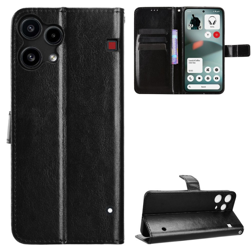 Étui portefeuille élégant pour Nothing Phone (3a) Lite 5G avec texture effet cuir vieilli. Dispose de 3 emplacements pour cartes, 1 compartiment pour espèces, fonction support mains-libres et fermeture magnétique sécurisée. Livré avec dragonne pratique.