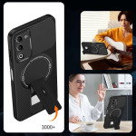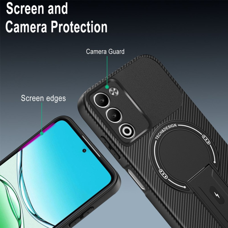 Protection robuste en TPU et PC avec texture fibre de carbone. Équipée d'un support pliable intégré pour un visionnage mains libres, d'un revêtement oléophobe anti-traces et d'une compatibilité support magnétique voiture.