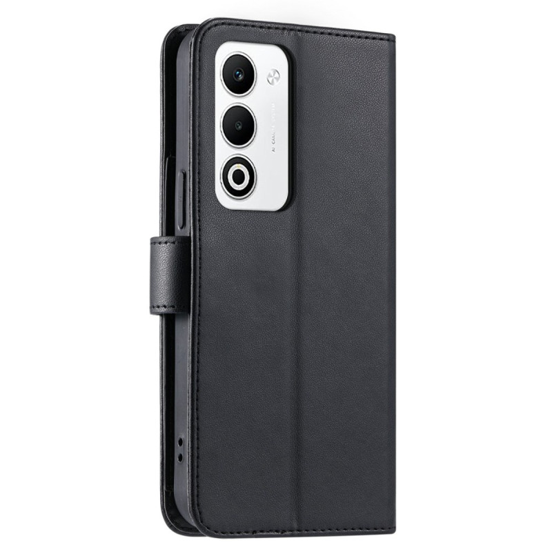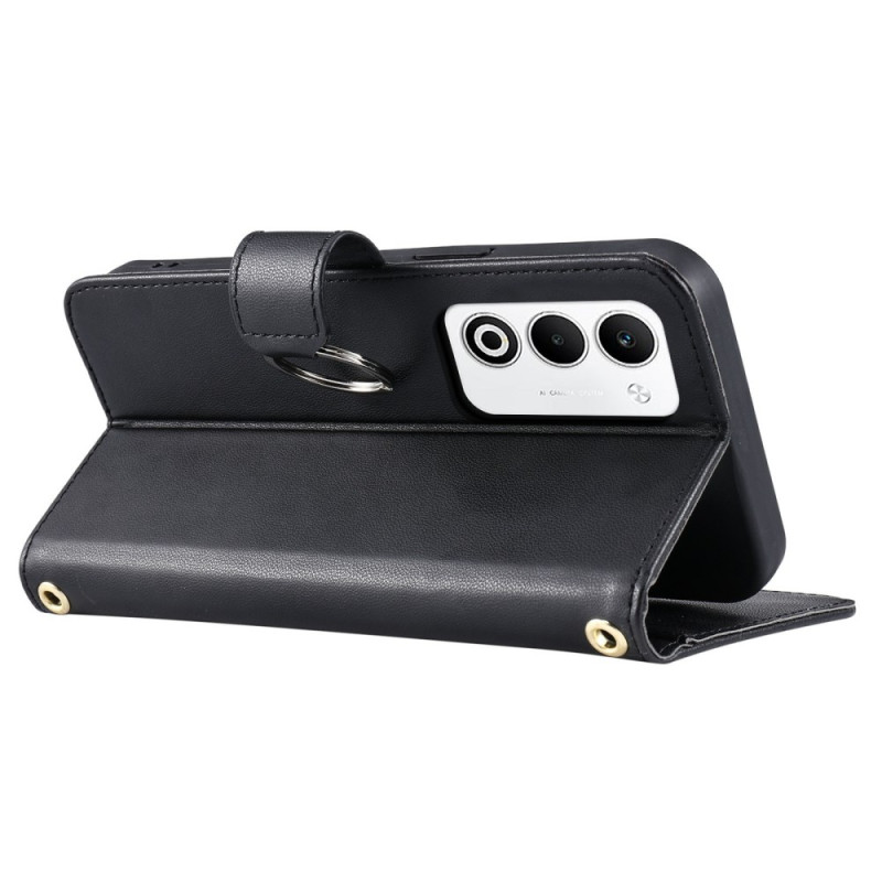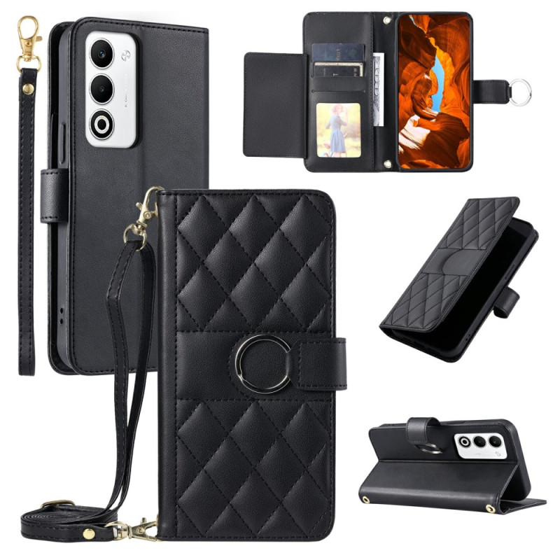 Étui portefeuille sophistiqué pour Oppo A5 5G / 4G en cuir PU premium avec motif losange élégant. Comprend un anneau support, 5 emplacements pour cartes, une poche à monnaie et deux bretelles amovibles pour un port polyvalent.
