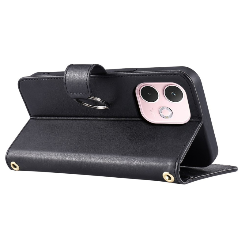 Élégant étui portefeuille à bandoulière avec motif losange sophistiqué. Dispose d'un anneau décoratif, support intégré, 5 emplacements pour cartes et poche monnaie. Livré avec deux bretelles pour porter à la main ou en bandoulière.