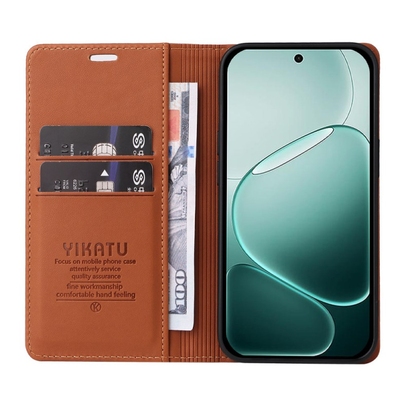 Découvrez l'étui portefeuille YIKATU alliant élégance et protection. Conçu en cuir PU premium avec coque TPU mate, il offre 2 emplacements pour cartes, 1 poche pour espèces et une fermeture magnétique sécurisée. Support mains libres intégré.