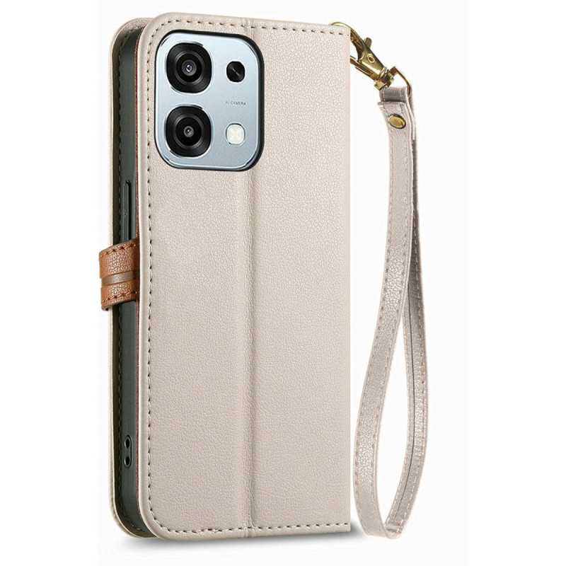 Étui en cuir PU élégant avec fermoir magnétique en forme de feuille pour Oppo A6 Pro 5G / 4G. Doté de 3 emplacements pour cartes, 1 poche pour espèces et une poche zippée extérieure. Stand intégré pour visionnage mains libres et dragonne détachable.