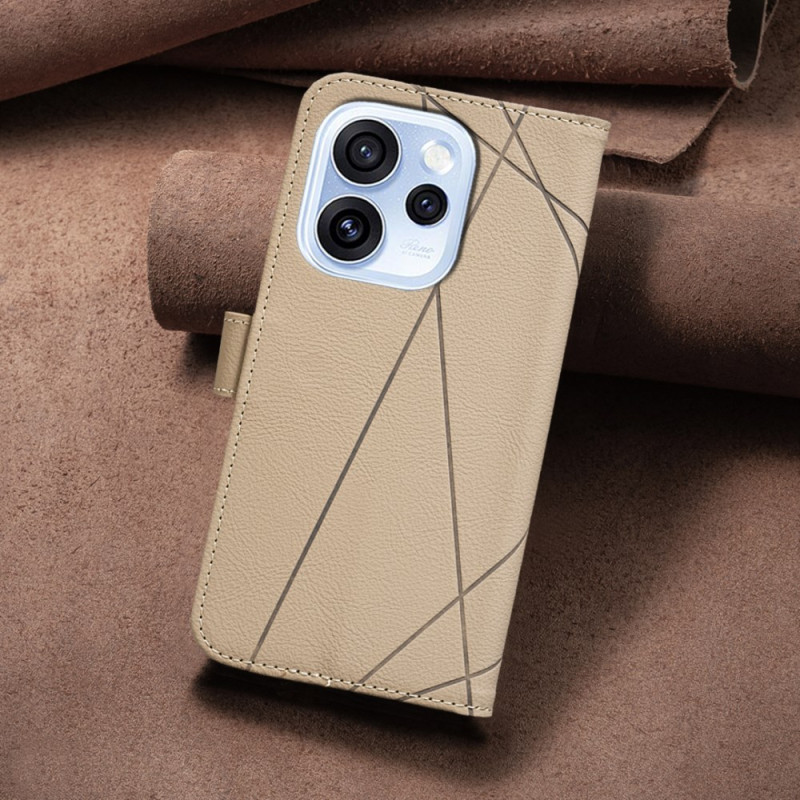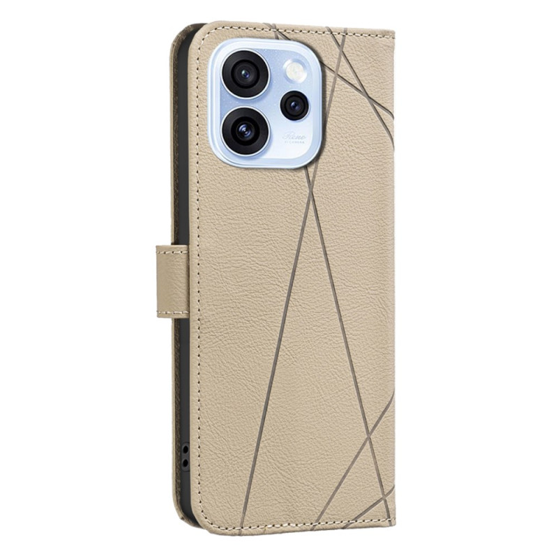 Protégez votre Oppo Reno 15 F 5G avec cet étui portefeuille élégant. Design géométrique moderne, blocage RFID anti-fraude, 3 emplacements pour cartes et compartiment à billets. Support pliable intégré pour une visualisation mains libres optimale.