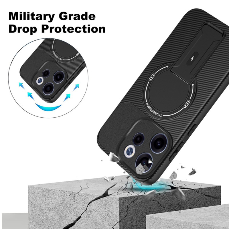 Protégez votre Oppo Reno15 F 5G avec cette coque hybride robuste. Dotée d'une texture fibre de carbone élégante, d'un support intégré rétractable et d'une technologie de dissipation thermique, elle offre une protection militaire contre les chocs tout en restant compatible avec les supports magnétiques de voiture.