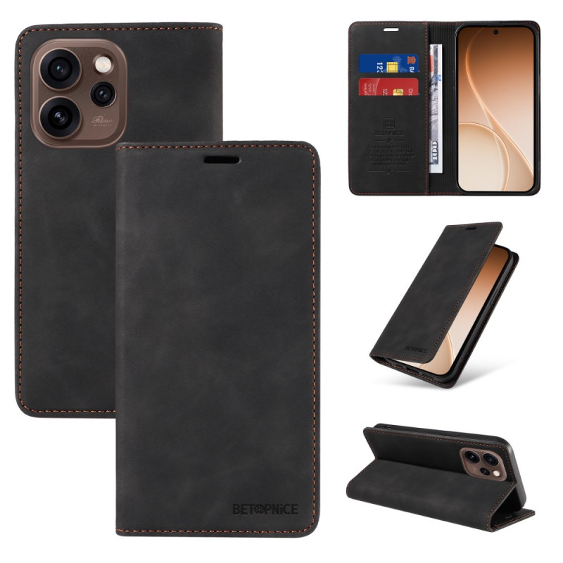 Étui portefeuille en cuir pour Oppo Reno 15 Pro 5G avec fermeture magnétique sécurisée et technologie de blocage RFID. Comprend 2 fentes pour cartes, 1 poche pour espèces et un support réglable pour une visualisation mains libres optimale.