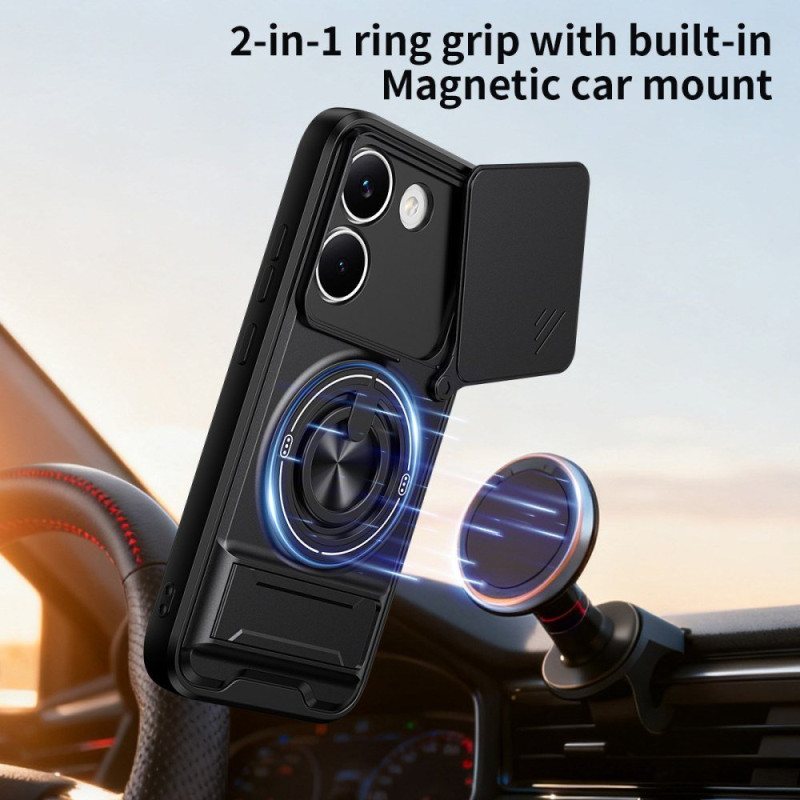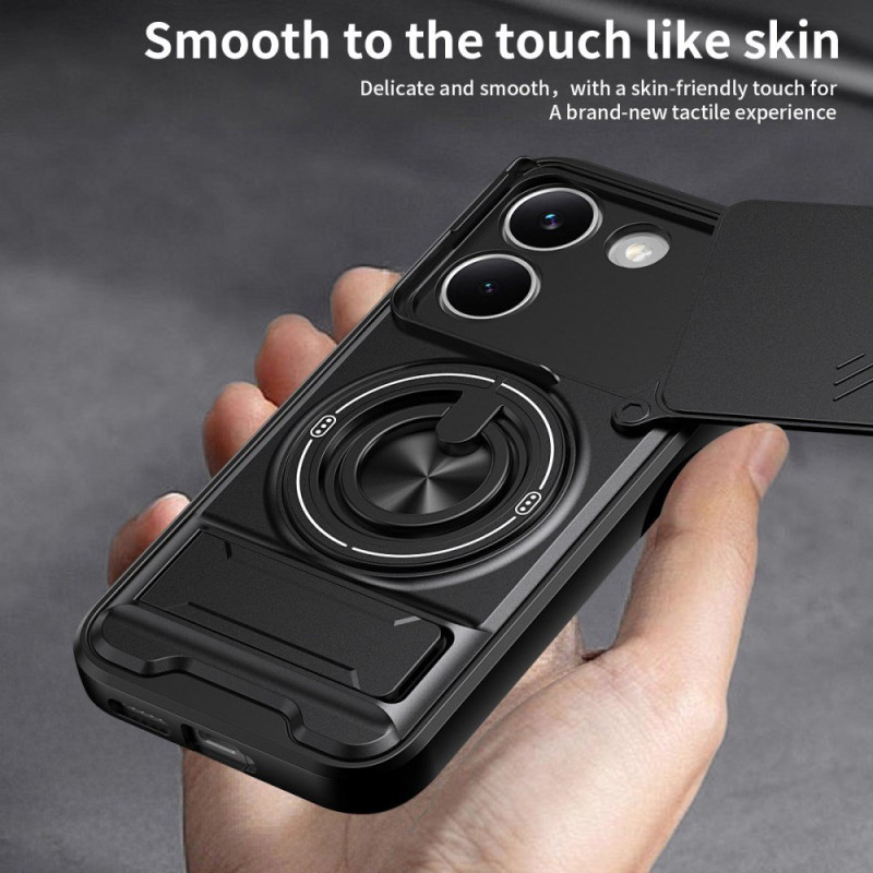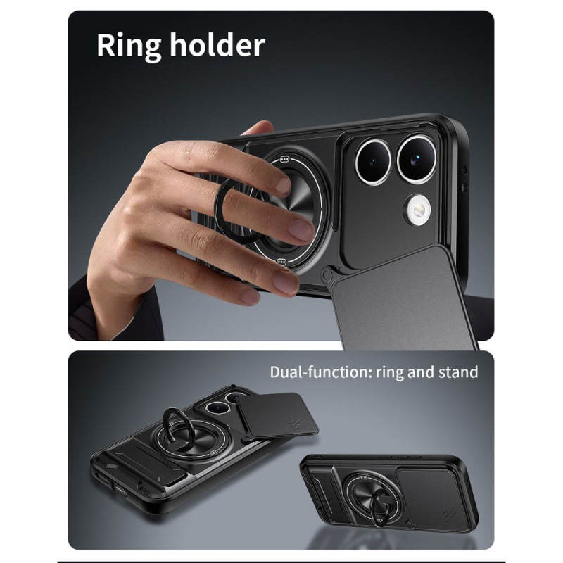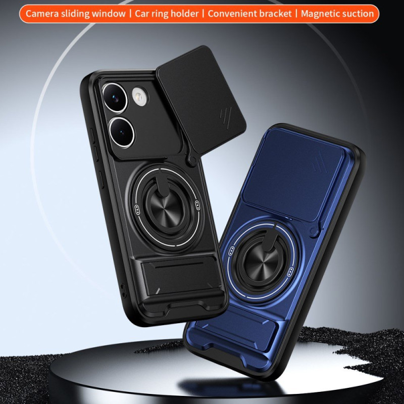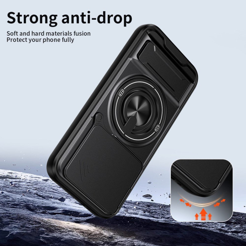 Sa double couche de protection garantit une résistance aux chocs et aux rayures, tandis que son anneau rotatif et sa béquille