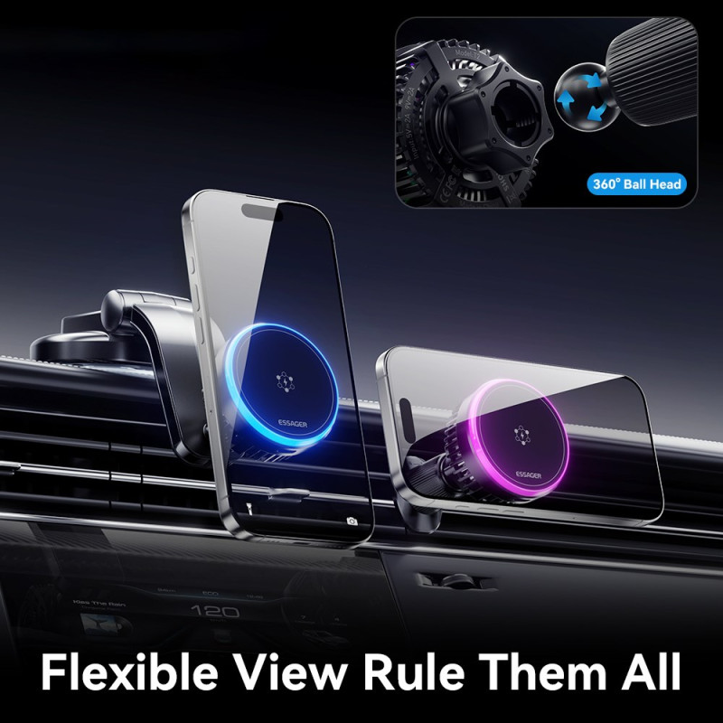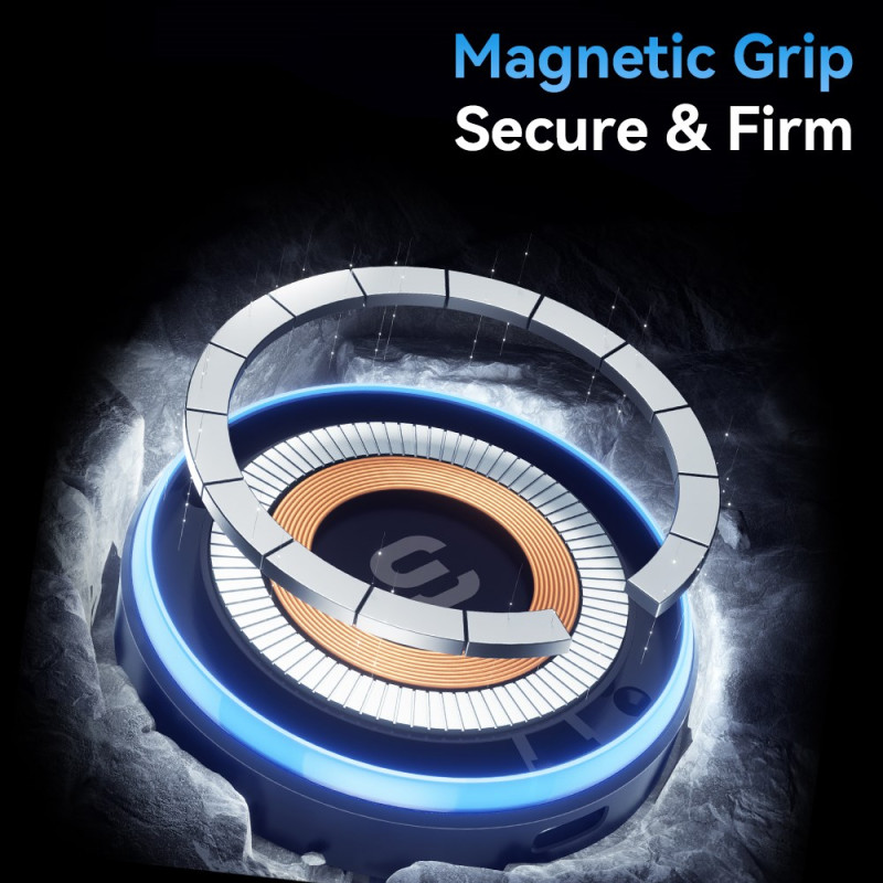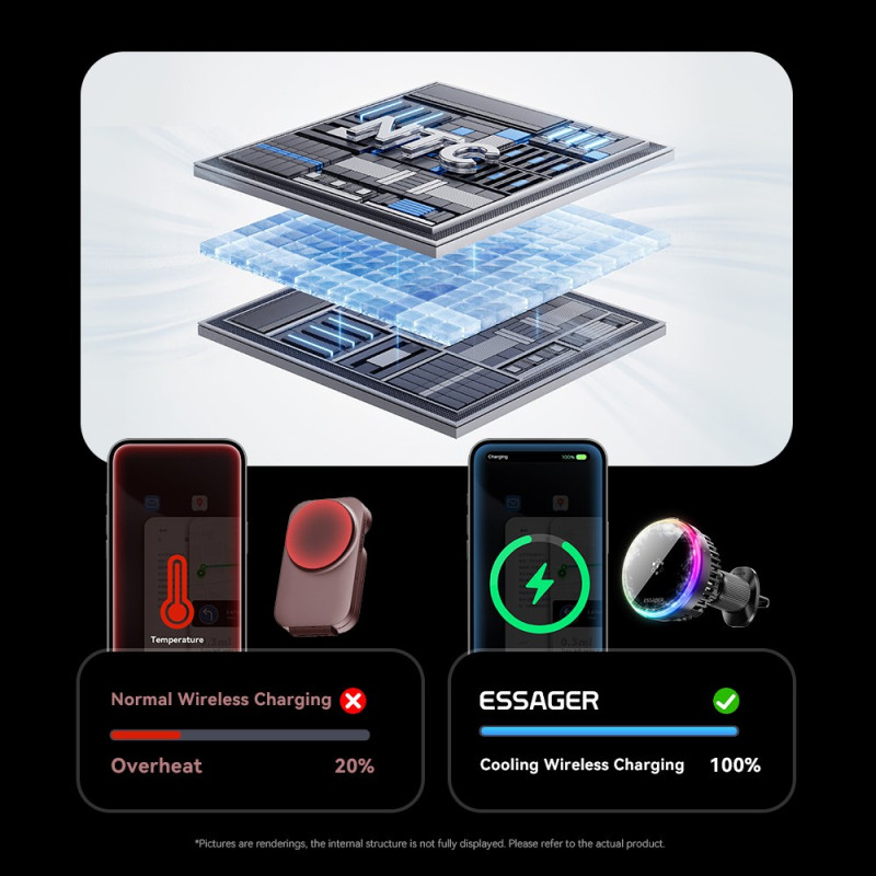 Chargeur sans fil magnétique innovant de 15W avec système de refroidissement TEC avancé et ventilateur haute vitesse. Installation facile sur grille d'aération, rotation 360° pour un positionnement optimal. Recharge rapide et sécurisée avec indicateur LED.