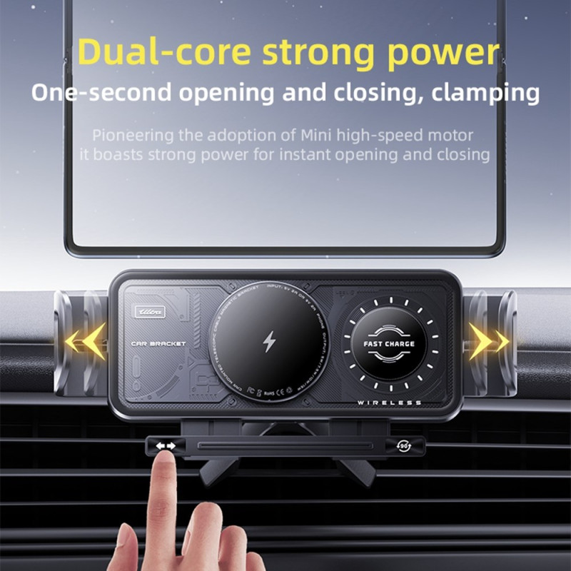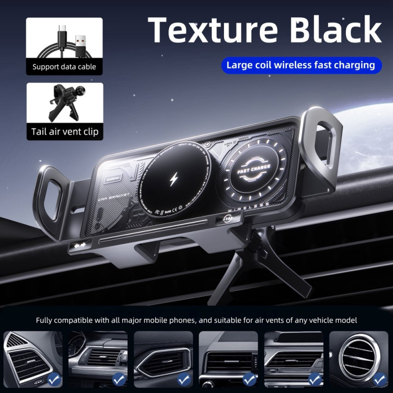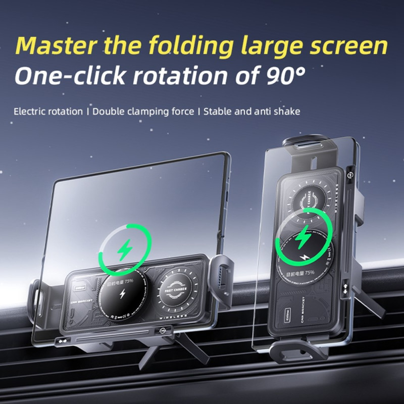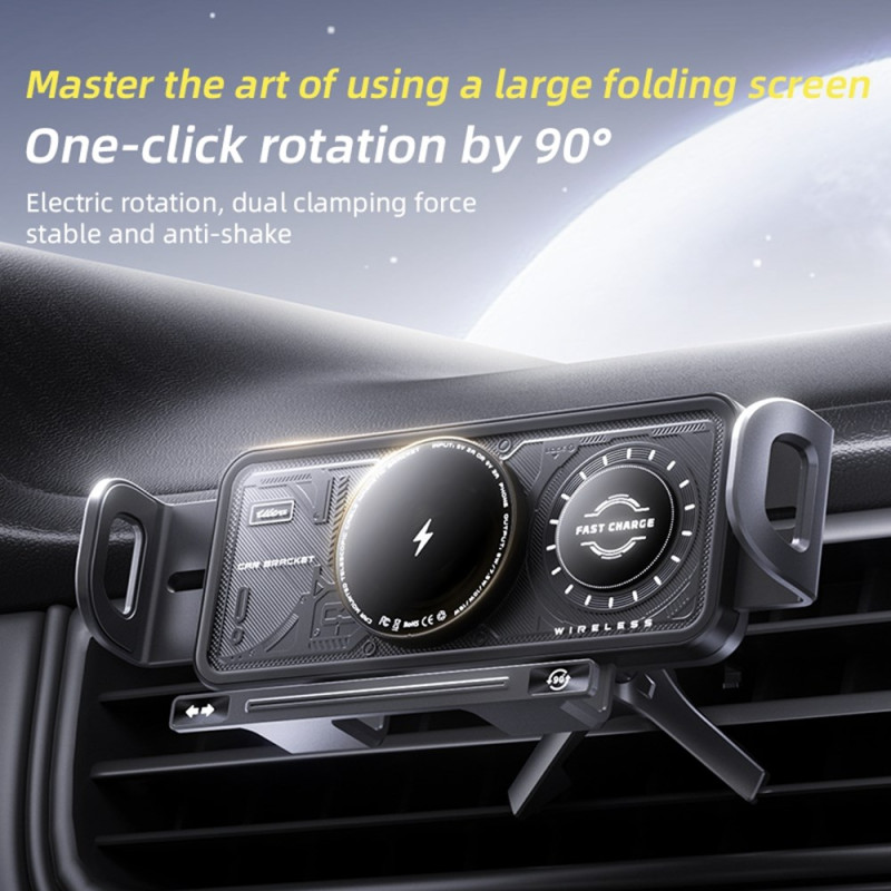 Découvrez le support de voiture SD04 avec chargeur sans fil 15W. Conçu pour smartphones pliables et classiques, il offre une rotation électrique à 360°, une fonction de libération automatique et une installation facile sur grille d'aération...