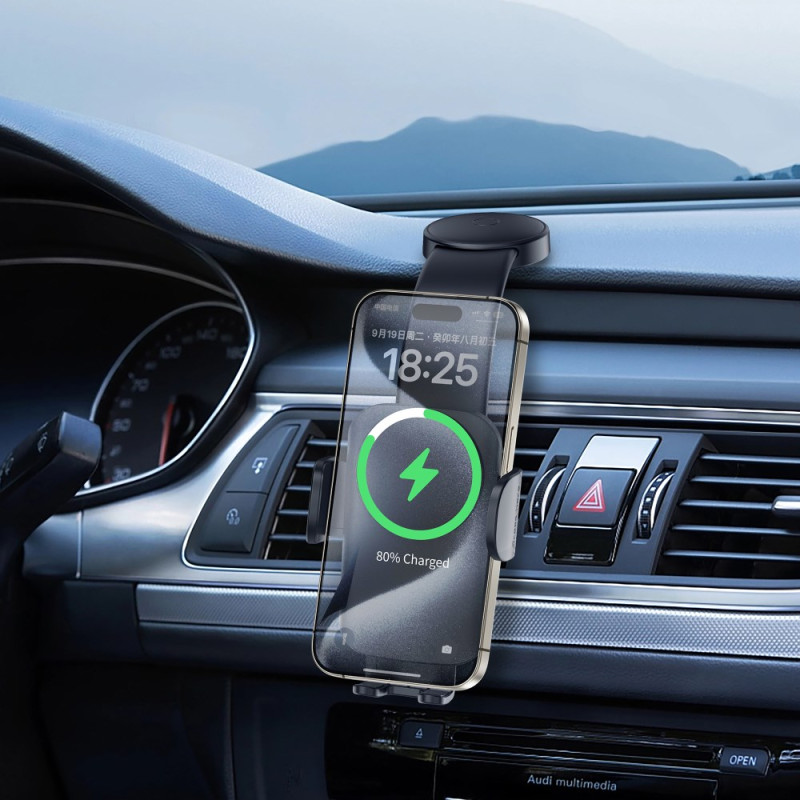 Découvrez le support voiture WIWU CH-322 : un chargeur sans fil 15W ultra-rapide avec serrage automatique intelligent. Placez simplement votre téléphone et laissez les bras se refermer automatiquement pour une prise sécurisée. Sa base adhésive robuste s'adapte à tous les tableaux de bord lisses. Design ergonomique qui n'obstrue ni votre vue ni le port de charge de votre appareil.