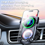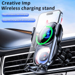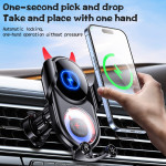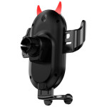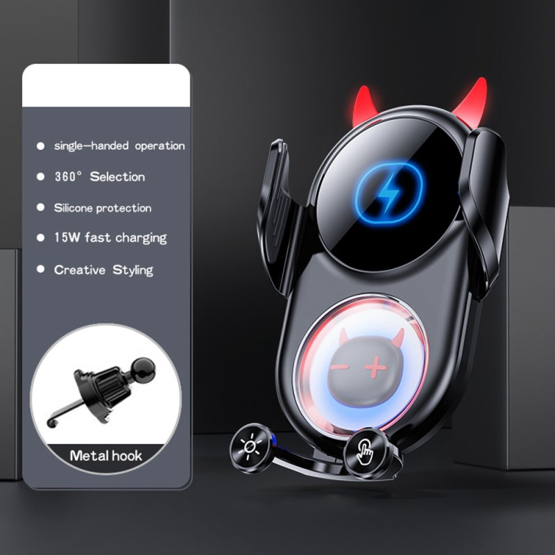Chargeur sans fil rapide 15W avec fixation sur grille d'aération au design Devil. Compatible avec tous les appareils Qi (iPhone, Samsung, Huawei). Technologie magnétique pour une fixation instantanée et éclairage d'ambiance intégré.