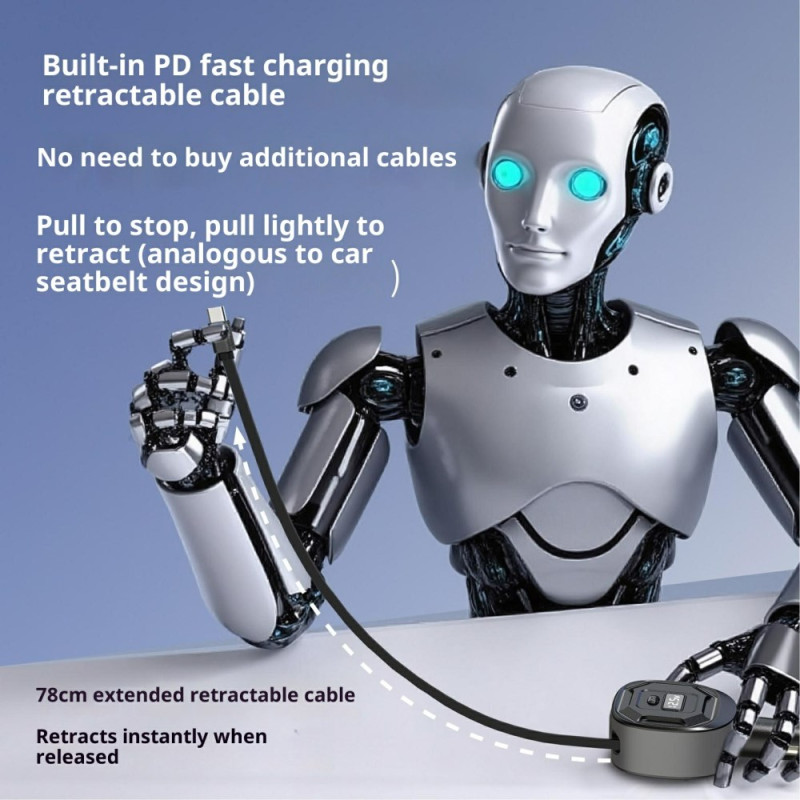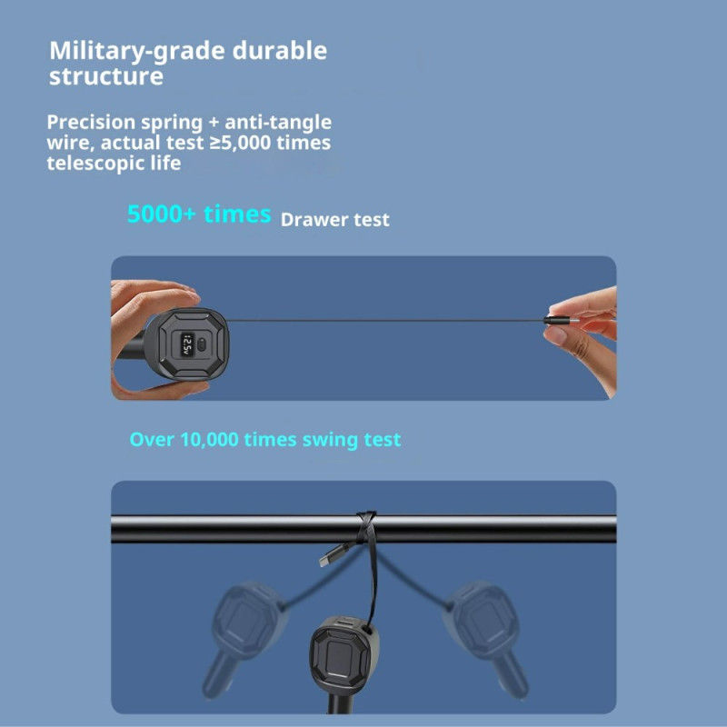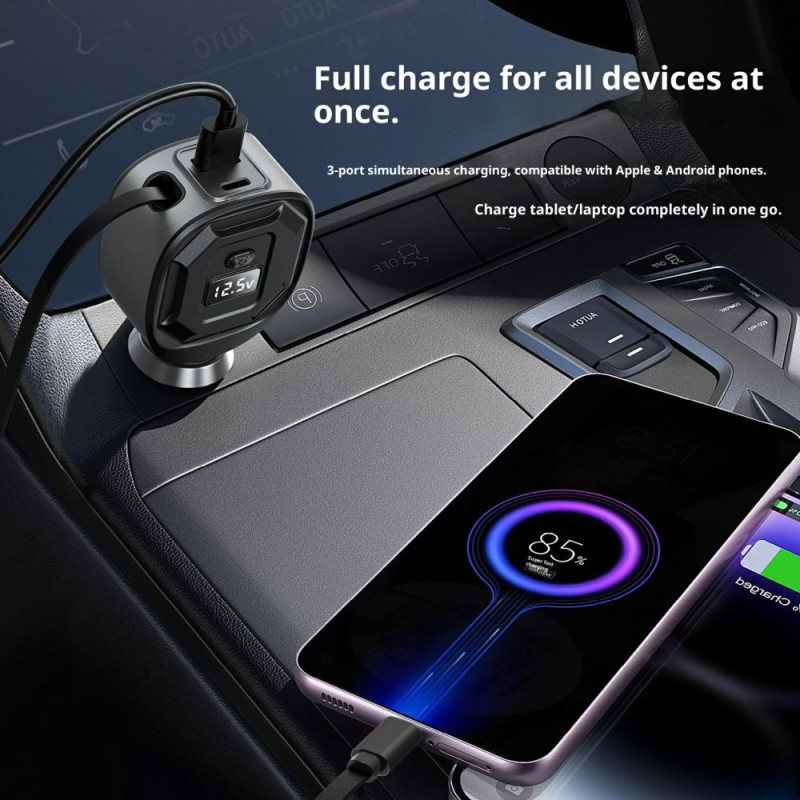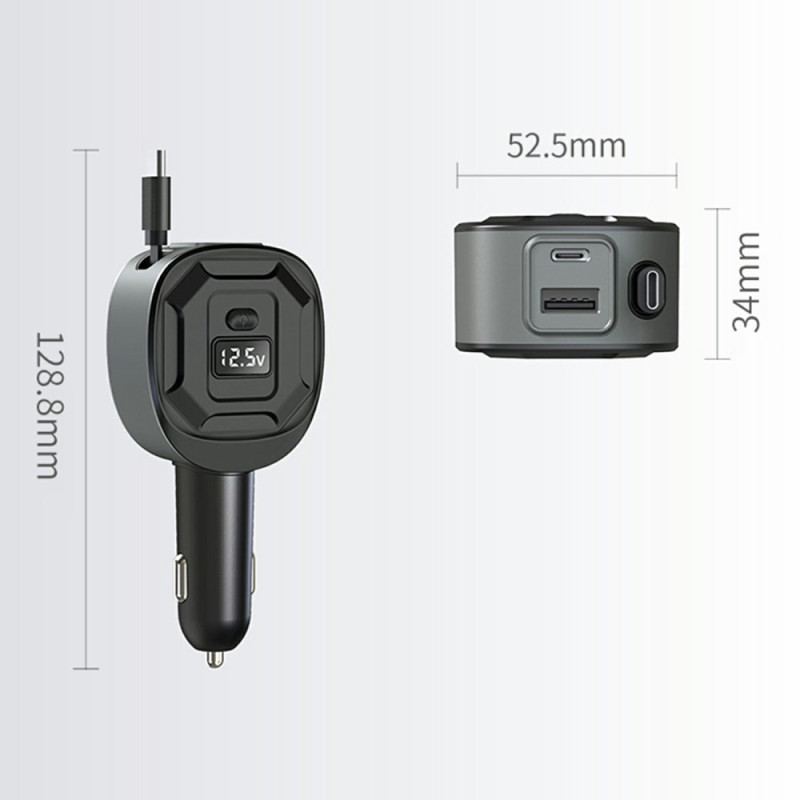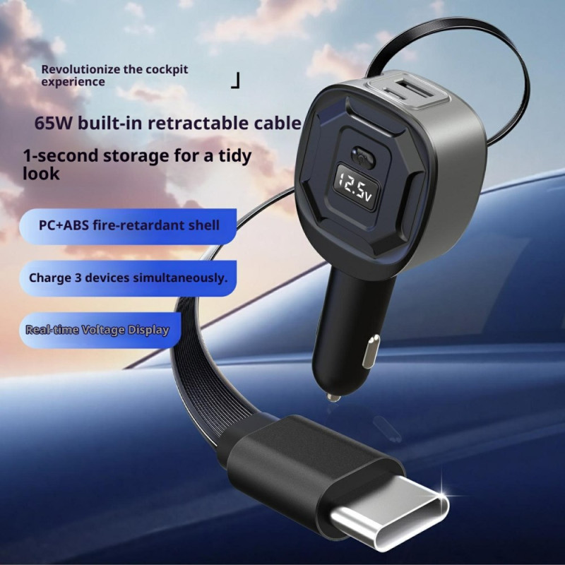 Chargeur voiture haute performance avec double port de charge rapide (65W PD + 18W USB-A) et câble rétractable de 78cm. Affichage LED de la tension de batterie en temps réel pour une charge sécurisée. Compatible avec tous véhicules 12V-24V.