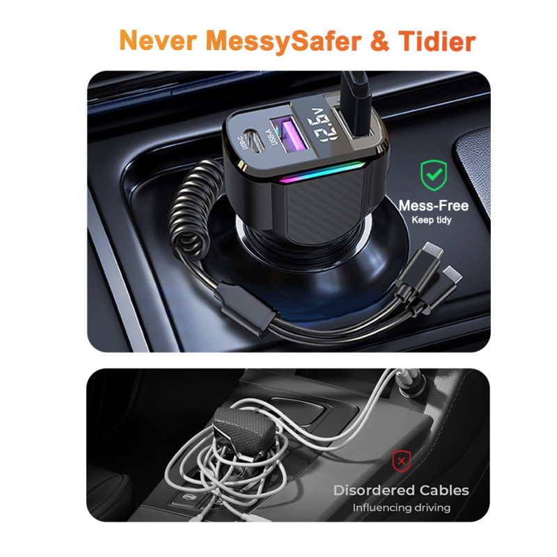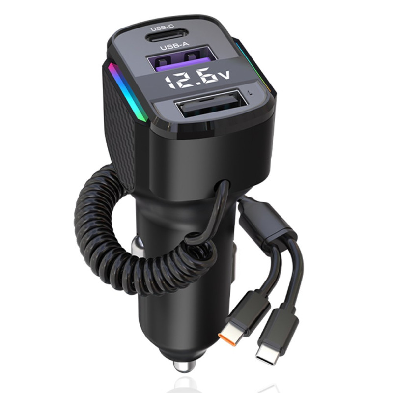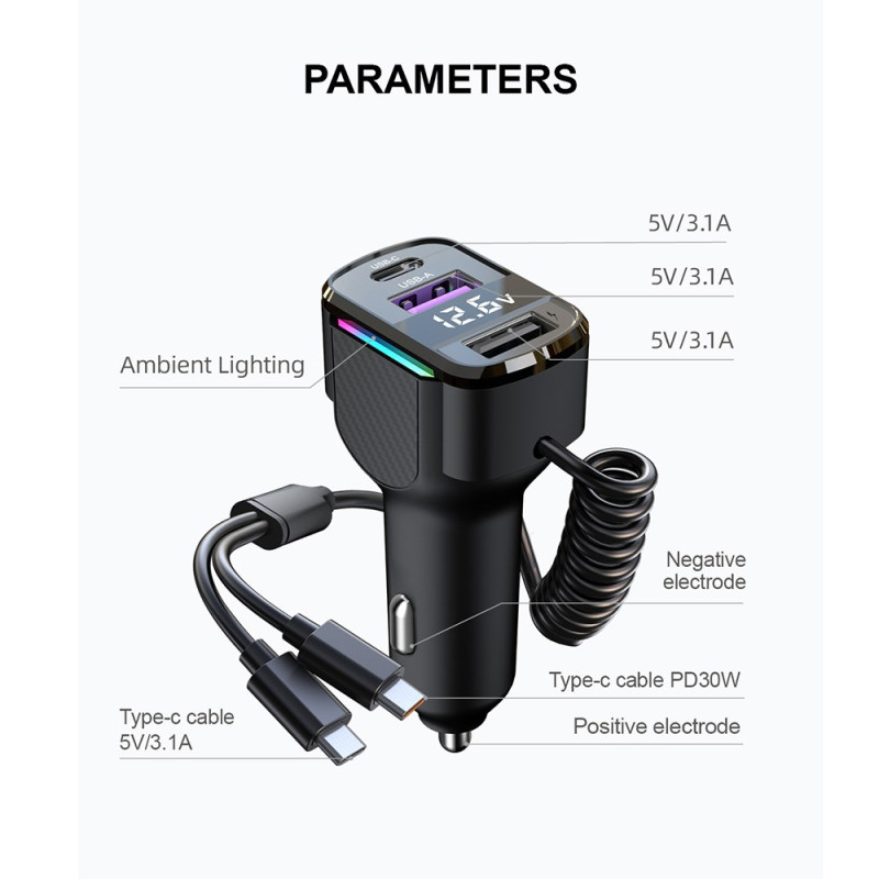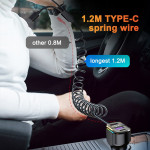 Chargeur voiture haute performance avec charge rapide PD 30W et câble spirale Type-C de 1,2m. Lumière LED colorée pour localisation facile dans l'obscurité. Compatible avec tous vos appareils : iPhone, Samsung, Xiaomi, Huawei et tablettes.