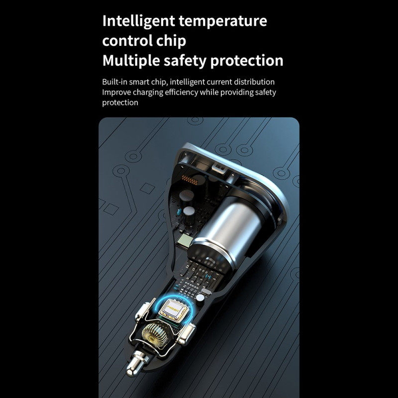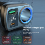 Chargeur allume-cigare intelligent 3-en-1 avec affichage digital de tension en temps réel. Offre une charge rapide PD 30W via port Type-C, port USB QC 3.0 18W et prise allume-cigare pour charger simultanément plusieurs appareils.