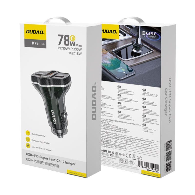 Rechargez tous vos appareils en déplacement avec le chargeur voiture DUDAO R78. Doté de 3 ports de charge rapide (2x USB-C PD 30W + 1x USB-A QC 18W), il délivre une puissance totale de 78W pour charger simultanément votre iPhone et autres dispositifs.
