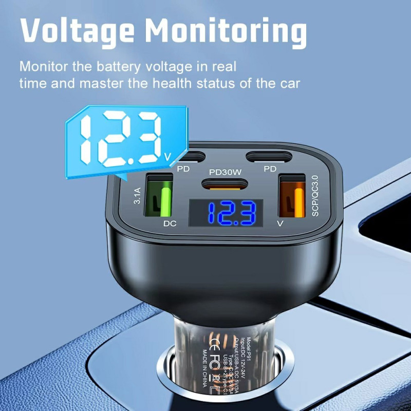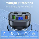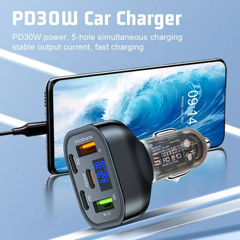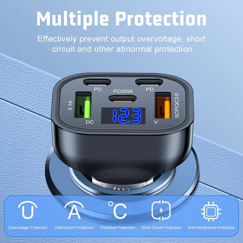 Chargeur voiture haute performance 150W avec 5 ports (3 Type-C + 2 USB) et technologie de charge rapide QC3.0 PD. Doté d'une puce intelligente à double cœur et d'un affichage de tension en temps réel pour une charge optimale de tous vos appareils.