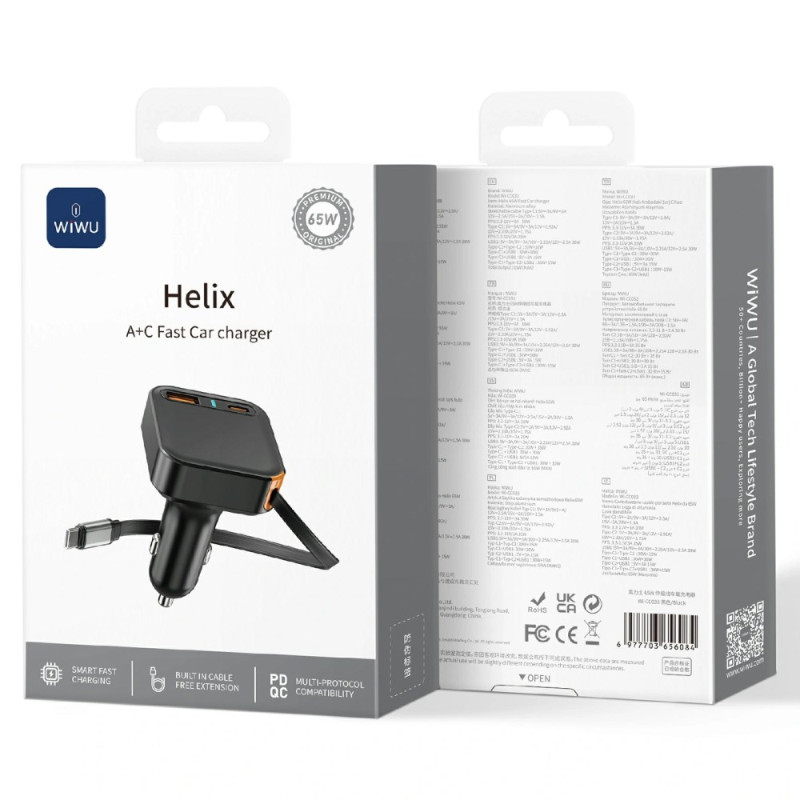 Chargeur voiture rapide 65W avec double port USB-A et USB-C, intégrant un câble Type-C rétractable de 60cm. Compatible avec les protocoles PD et PPS pour une charge ultra-rapide de tous vos appareils. Technologie intelligente de répartition de puissance et système de refroidissement avancé.