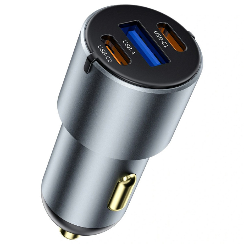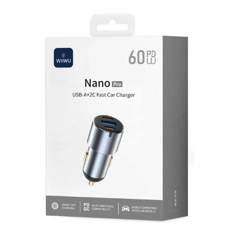 Chargeur voiture haute performance WIWU Nano Pro avec double port USB-C et port USB-A offrant une charge rapide jusqu'à 60W. Distribution intelligente de la puissance jusqu'à 30W par port pour charger simultanément plusieurs appareils...