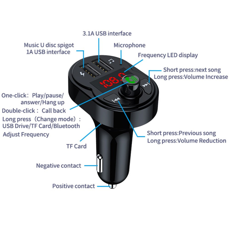 Transformez vos trajets avec ce chargeur voiture multifonction X1. Profitez d'appels mains libres Bluetooth 5.3, d'une charge rapide 3.1A et d'un transmetteur FM pour diffuser votre musique préférée. Compatible USB, carte TF et tous véhicules 12V-24V.