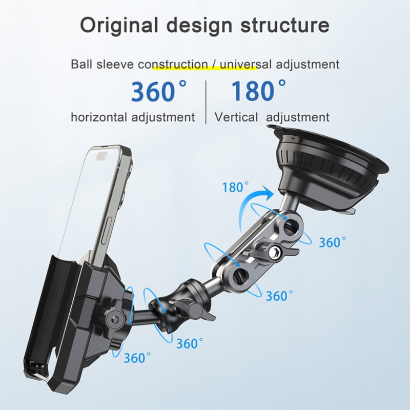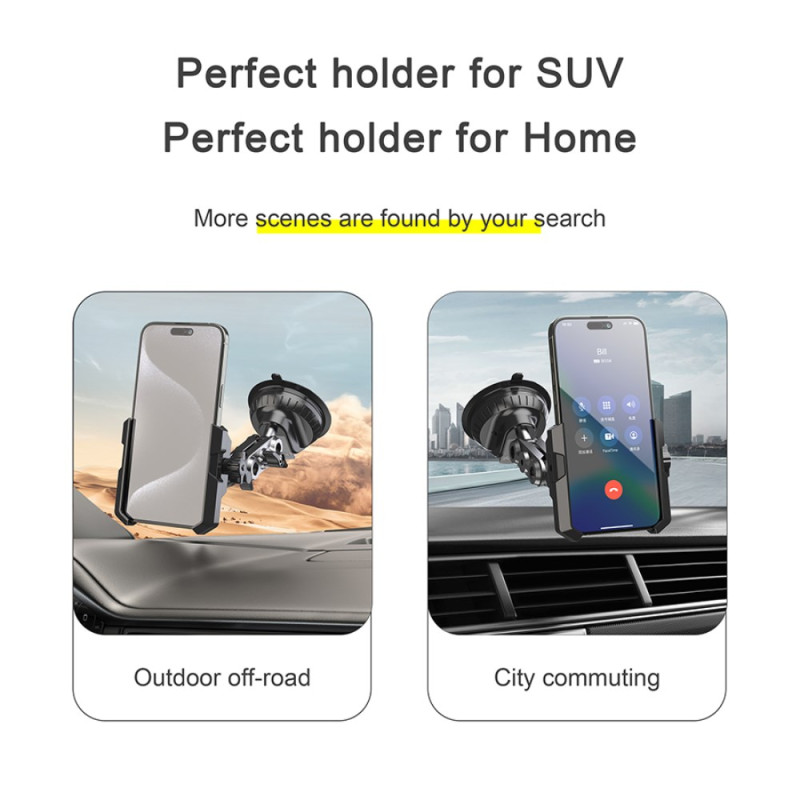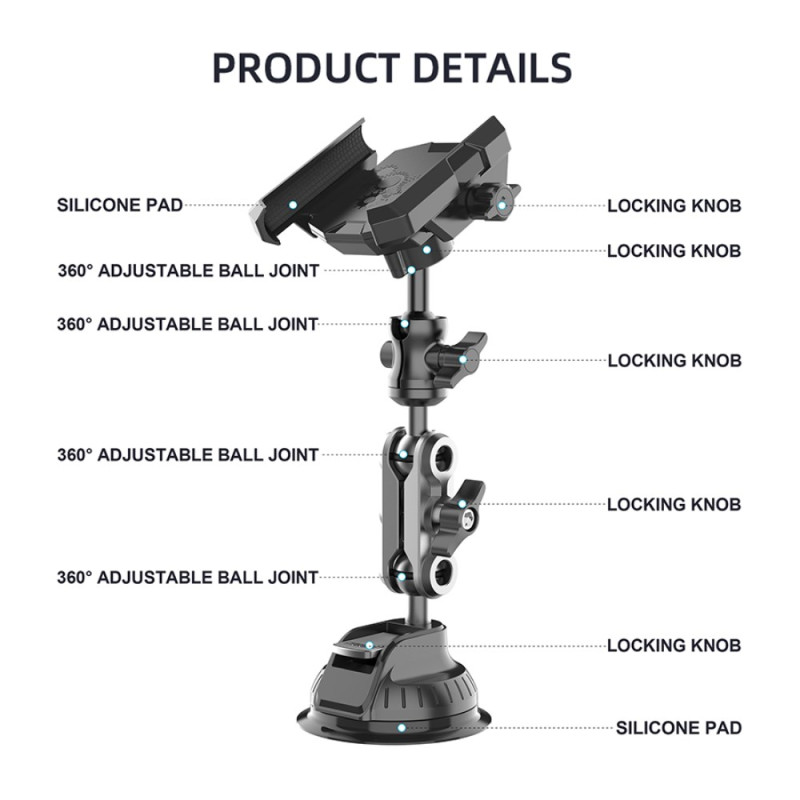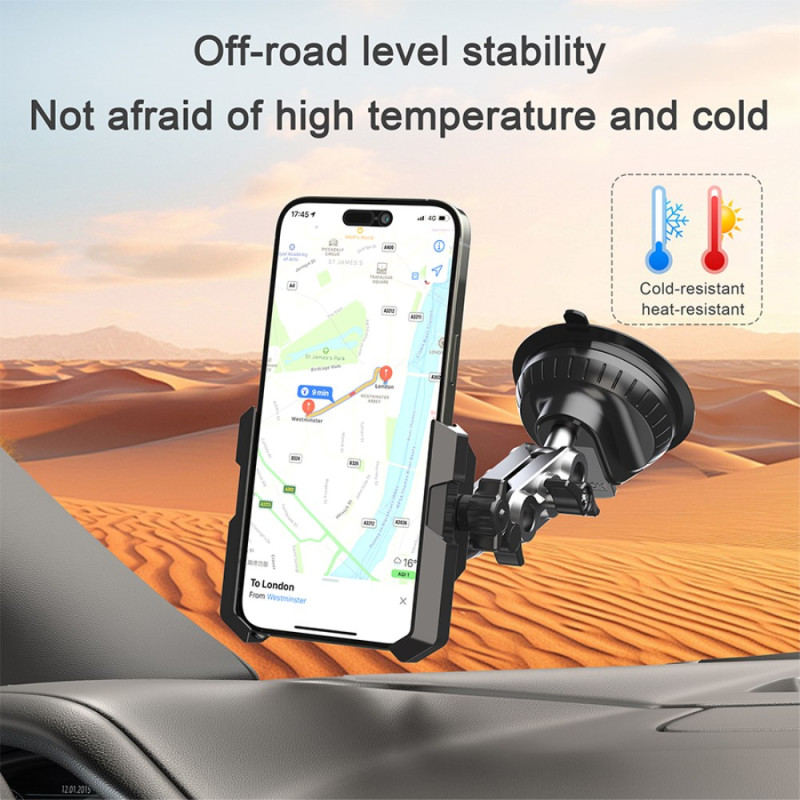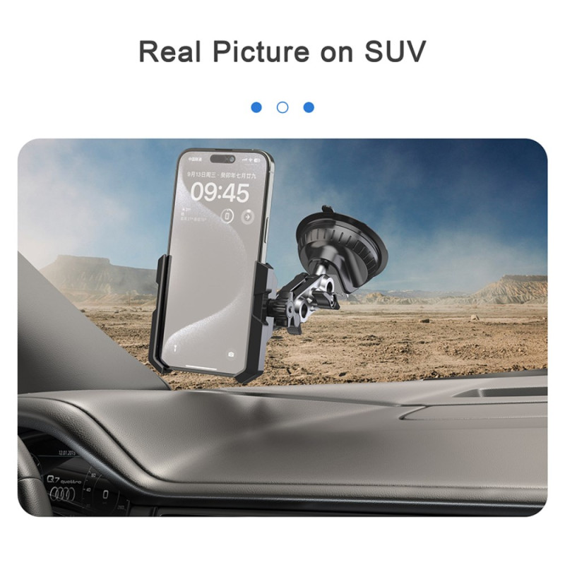 Support de téléphone universel avec ventouse puissante pour pare-brise et tableau de bord. Rotule ajustable 360° pour un angle de vue optimal. Base triple renforcée garantissant une stabilité maximale même sur routes difficiles. Compatible avec smartphones de 4,7 à 7,2 pouces.