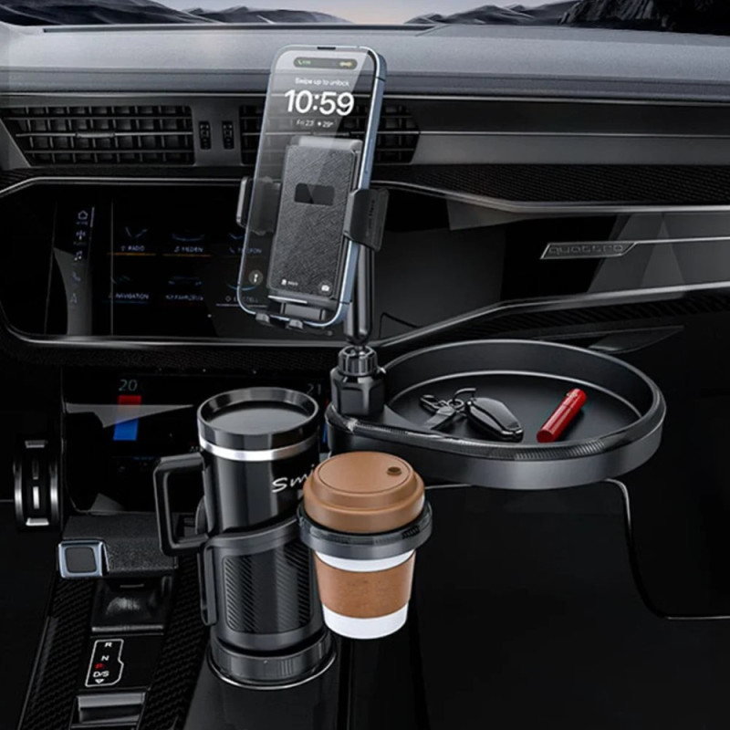 Transformez votre porte-gobelet en station multifonction ! Ce support universel 4-en-1 combine support téléphone rotatif 360°, plateau de rangement et doubles porte-gobelets. Installation facile par simple rotation, compatible avec la plupart des véhicules.