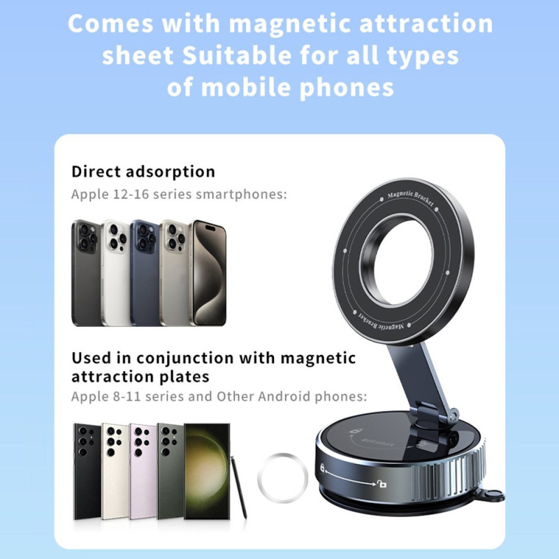 Support magnétique universel pour voiture avec ventouse ultra-adhérente et rotation 360°. Profitez d'une navigation optimale grâce à son bras réglable et sa puissante attraction magnétique de 20N. Installation facile sans outils, compatible avec tous les smartphones équipés de charge sans fil magnétique.