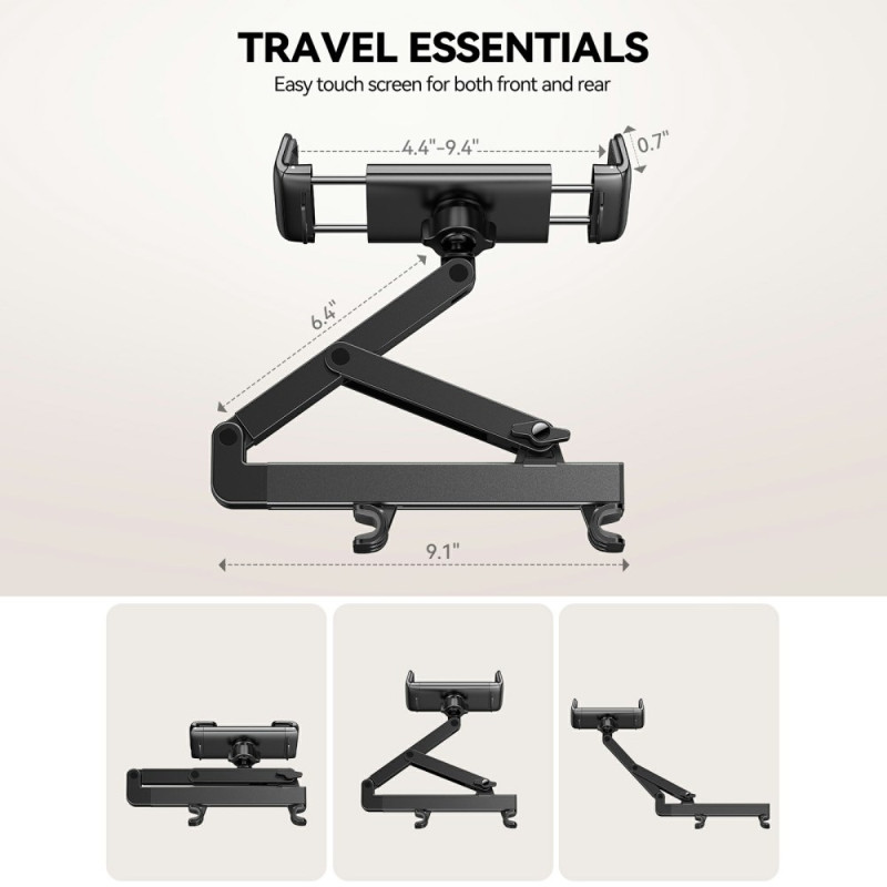 • Large compatibilité conçue pour s'adapter aux appuis-tête avec espacement de 70 à 158mm et accueillir des appareils de 4,7 à 13 pouces