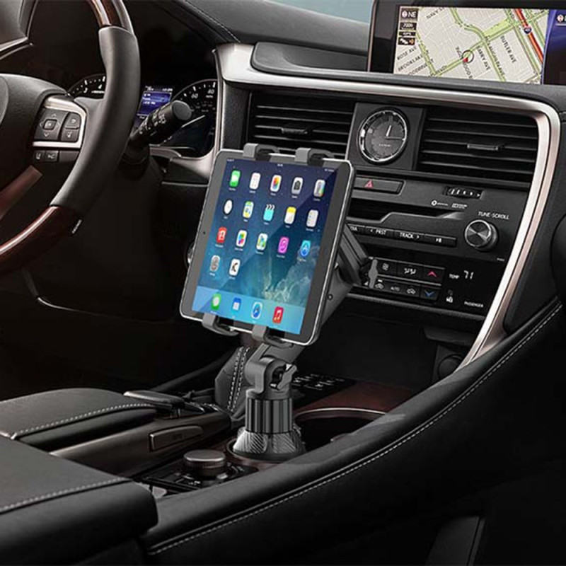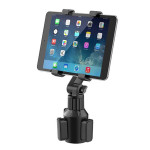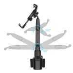 Support universel de tablette pour porte-gobelet de voiture avec col long ajustable et rotation à 360°. Base robuste et stable, installation facile sans adhésif. Compatible avec les appareils de 12,5 à 20 cm. Parfait pour la navigation GPS.