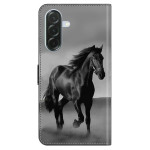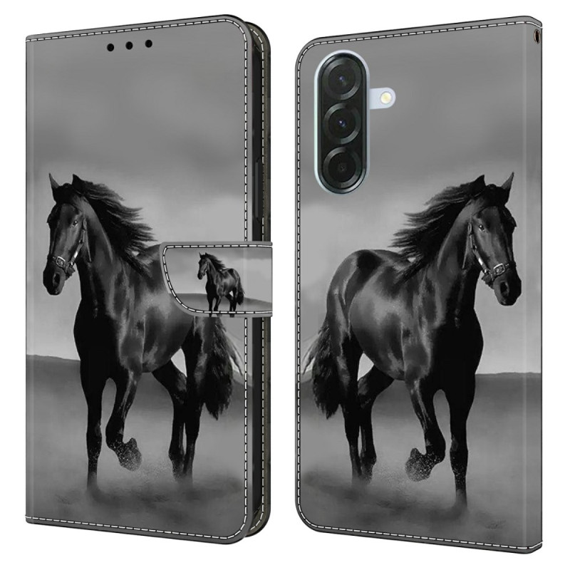 Étui portefeuille élégant avec motif cheval noir en relief 3D pour Samsung Galaxy A37 5G. Fermeture magnétique sécurisée, support intégré et emplacements pour cartes. Protection complète avec rebords surélevés pour l'objectif photo.