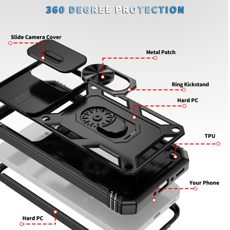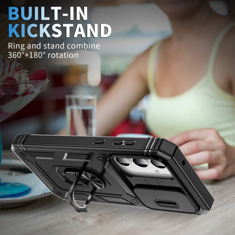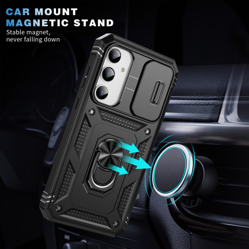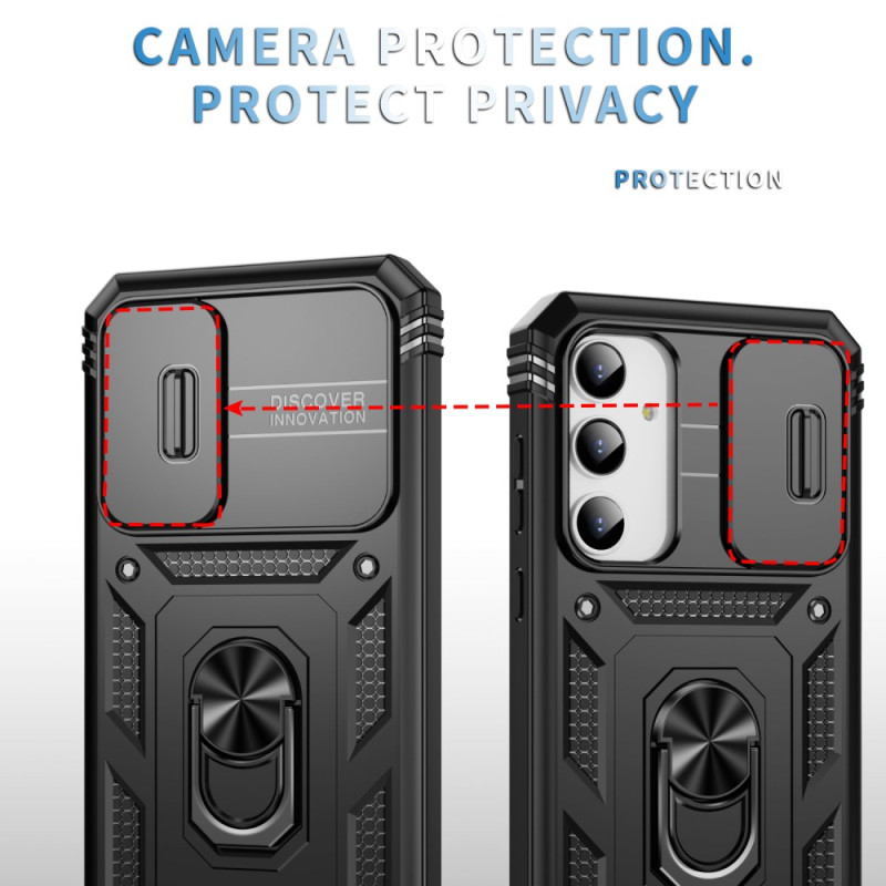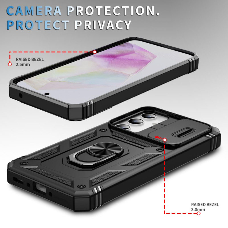 Découvrez notre coque hybride TPU+PC pour Samsung Galaxy A55 5G. Dotée d'un anneau rotatif ajustable, d'une protection de caméra coulissante et d'une résistance aux chocs à 360 degrés, elle offre une protection complète.