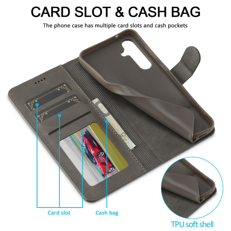 Étui portefeuille élégant pour Samsung Galaxy A57 5G avec texture cuir de veau. Comprend 2 emplacements pour cartes, 1 compartiment photo et 1 poche pour espèces. Support de visionnage pliable et fermeture magnétique sécurisée pour une protection complète.