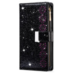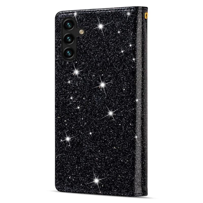 Étui portefeuille élégant pour Samsung Galaxy A57 5G avec design ciel étoilé gravé au laser et paillettes. Comprend des emplacements pour cartes, une poche zippée et une dragonne pratique pour un transport sécurisé.