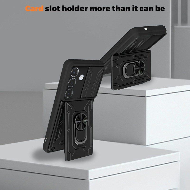 Protégez votre Samsung Galaxy A57 5G avec cette coque multifonctionnelle dotée d'un support métallique pliable, d'un porte-cartes intégré et d'une protection caméra coulissante. Compatible avec les supports magnétiques pour voiture.