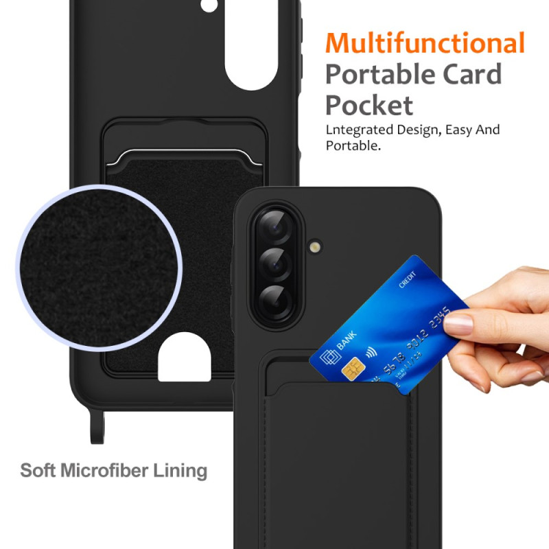 Coque en silicone liquide ultra-douce pour Samsung Galaxy A57 5G. Design pratique avec porte-carte intégré et cordon ajustable de 160cm. Protection renforcée de la caméra avec rebords surélevés. Installation et retrait faciles sans rayer votre téléphone.