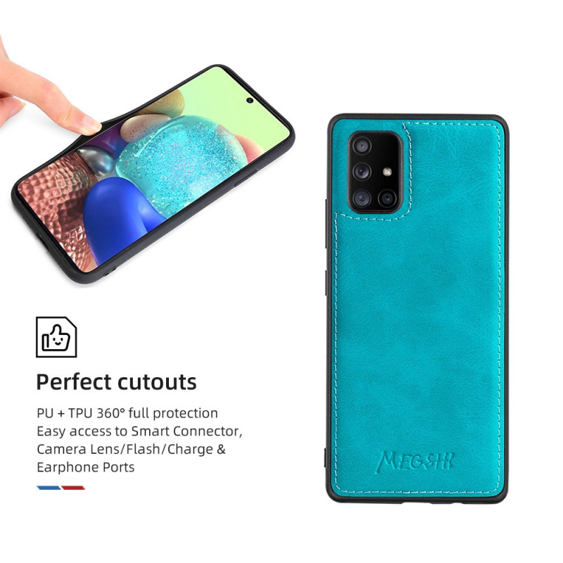 La housse pour Samsung Galaxy A71 5G en simili cuir, de la marque MEGSHI, assure une protection optimale avec des options portefeuille et la coque se détache.