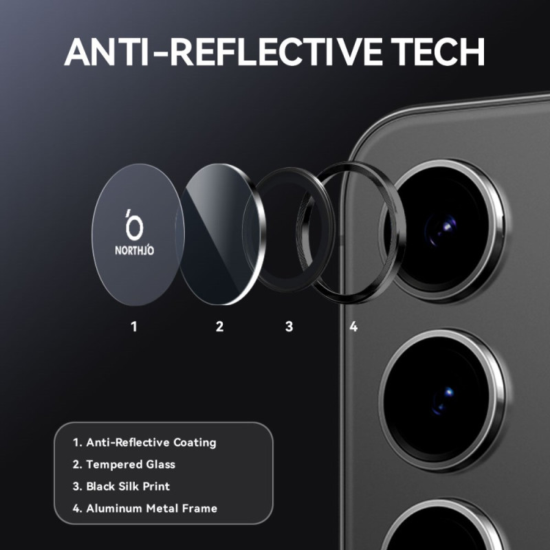 Découvrez la protection d'objectif NORTHJO pour Samsung Galaxy S25 FE. Avec son design élégant en aluminium à veines CD et son verre trempé 9H, elle offre une protection efficace contre les rayures et les chocs.