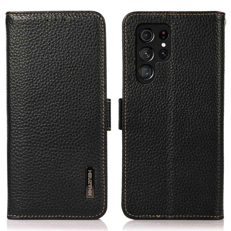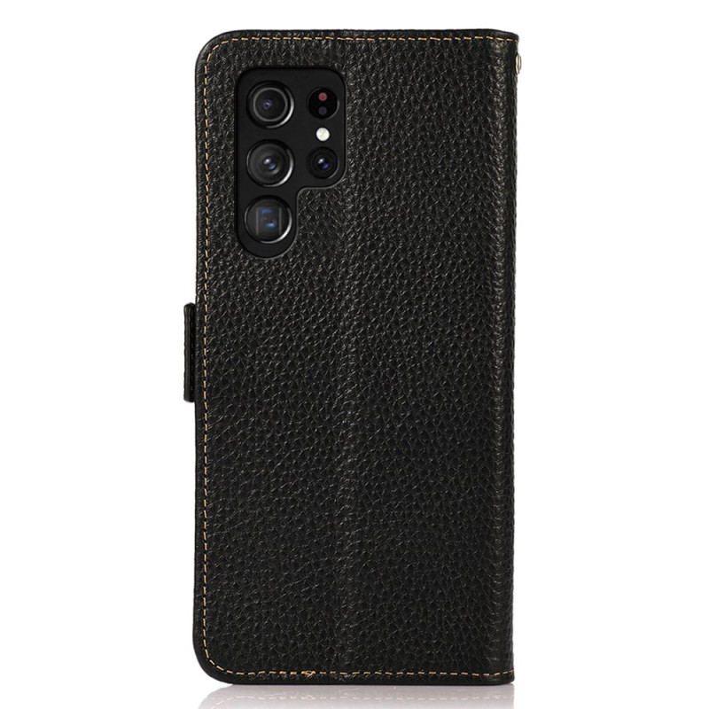 Étui sophistiqué en cuir véritable avec texture litchi pour Samsung Galaxy S26 Ultra. Profitez d'une protection RFID avancée, de fentes pour cartes pratiques et d'un support convertible pour visionner vos contenus en toute liberté.