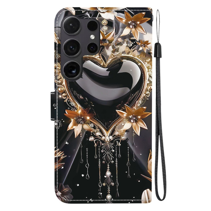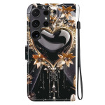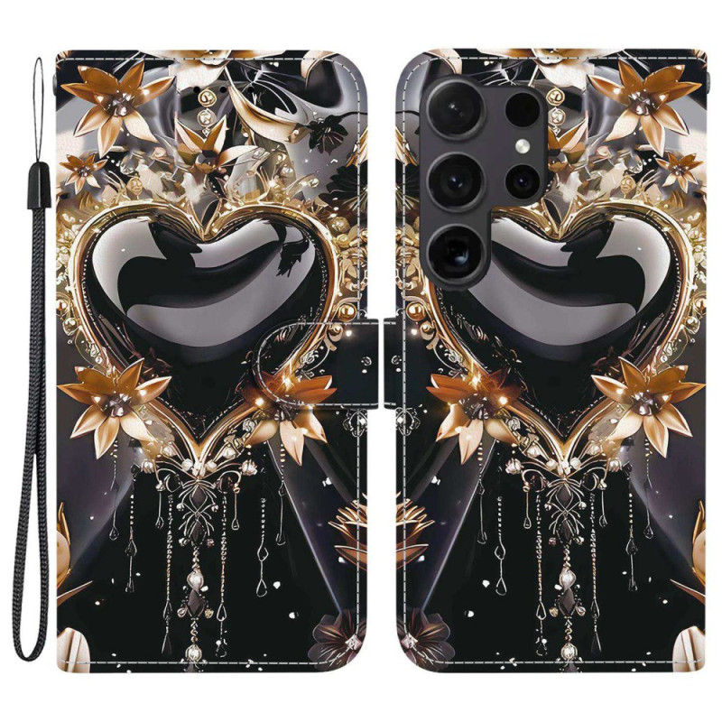 Protégez votre Samsung Galaxy S26 Ultra avec élégance grâce à cet étui portefeuille au motif cœur noir et or. Doté de fentes pour cartes, d'un support pliable et d'une dragonne pratique, il allie style et fonctionnalité.